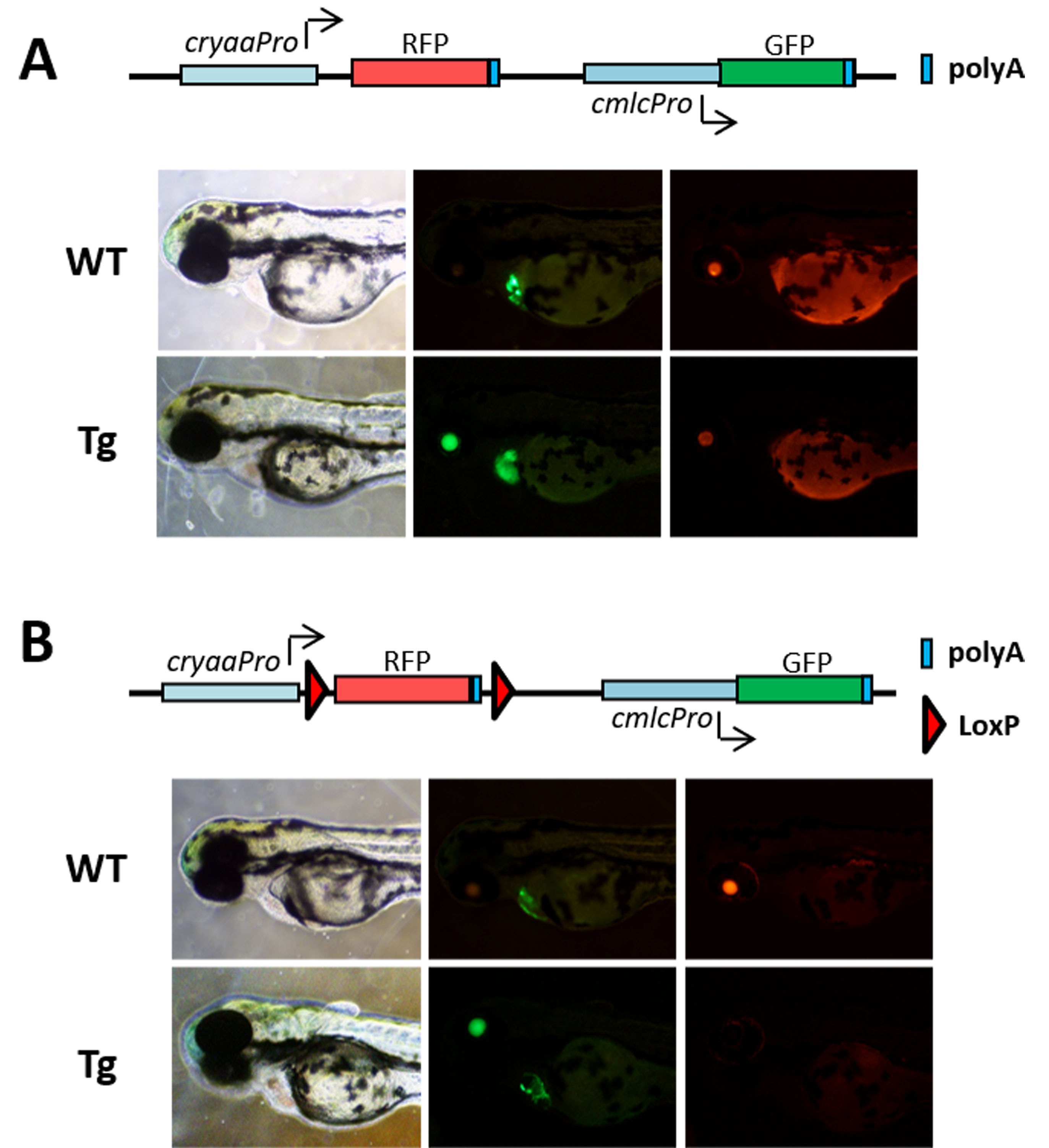 was expressed in the heart. B: Schematic map of the pcryaa:loxP-RFP-loxP-cmlc:EGFP plasmid and images of the 2 dpf lenses of WT and zTg(cryaa:Cre-cryaa:EGFP; Tg) zebrafish that were injected with pcryaa:loxP-RFP-loxP-cmlc:EGFP. RFP was specifically expressed in WT zebrafish lenses (upper panel) but not in zTg(cryaa:Cre-cryaa:EGFP) lenses (lower panel).