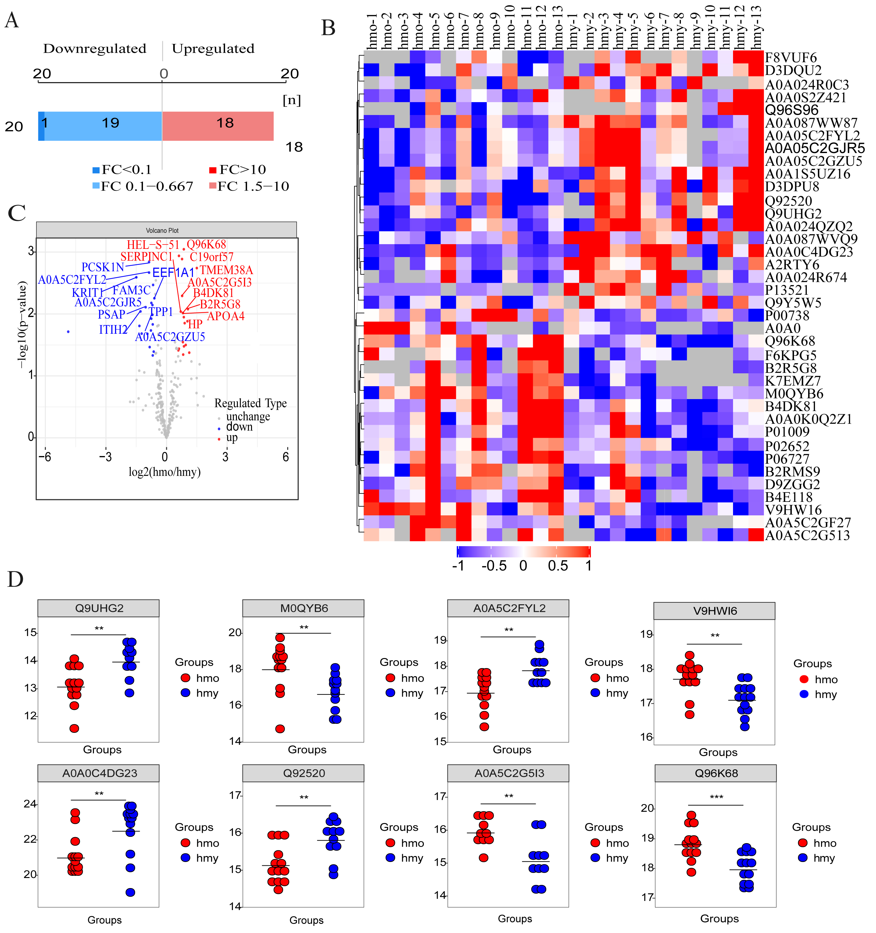 proteins, and gray represents no protein quantitative information. C: DEPs volcano plot showed that these were distributed in two different quadrants (the logarithm of the fold change of each