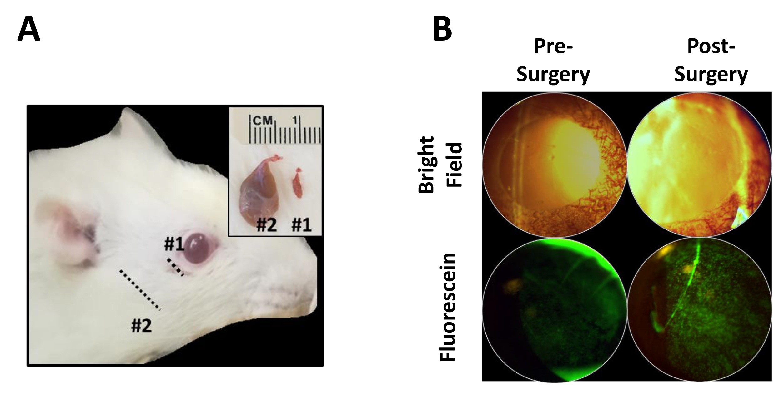 B: Bright-field and fluorescein staining of rat cornea pre- and post-DLGR surgery.