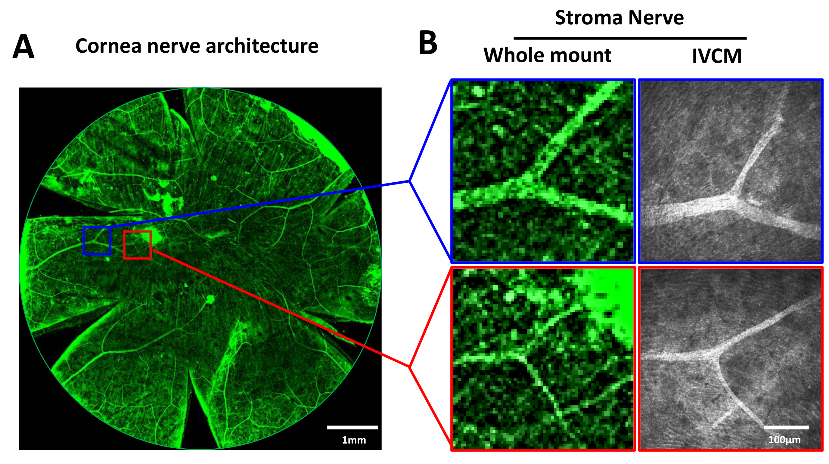 Two guide images of this rat cornea were visually compared with the nerve structure seen in the whole mount (B left, enlarged from whole mount; B right, IVCM).