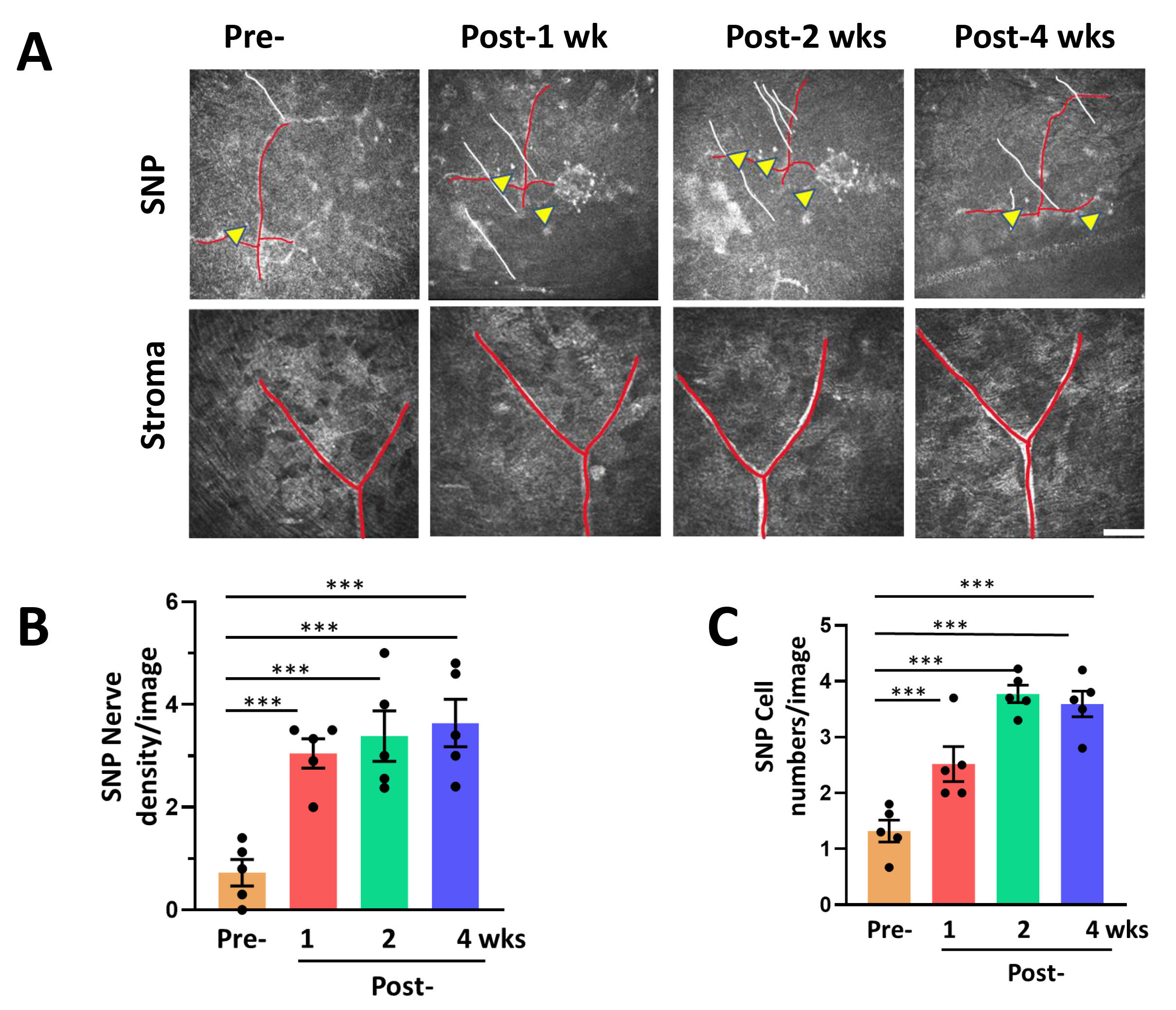 (A, lower panels at various time points) and the SNP (A, upper panels at various time points). White lines: detected SNP nerves. Yellow arrow: newly detected inflammatory cells.