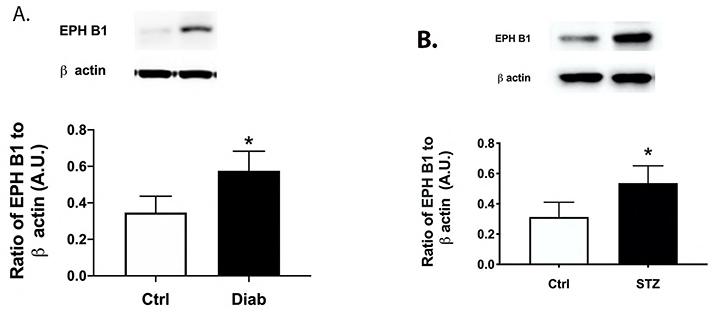 Figure 1. EphB1 protein levels are increased in the retinas of diabetic patients and diabetic mice. Western blotting was done for EphB1