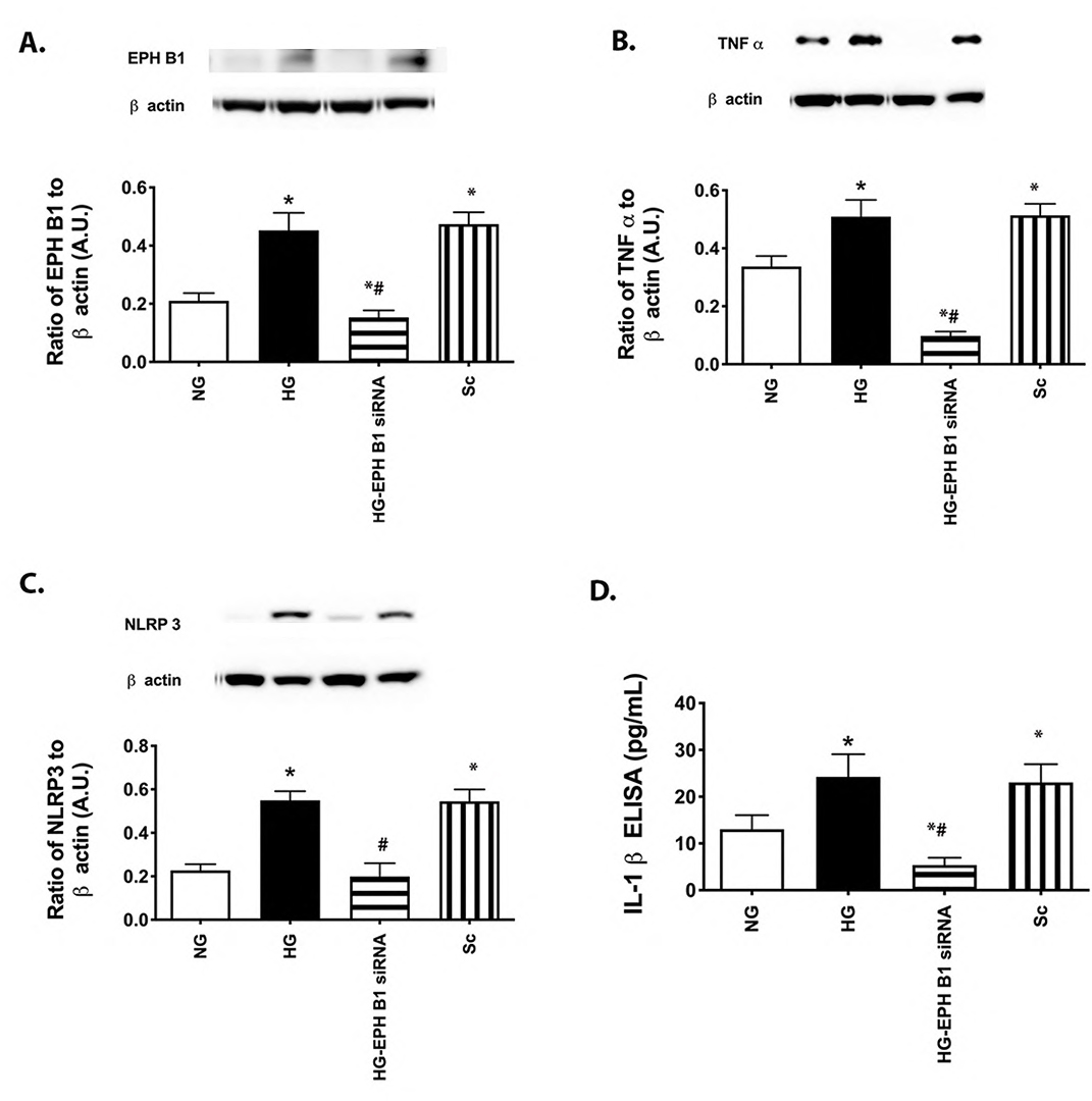 (B) TNFα, and (C) NLRP3. An ELISA was done for IL-1β in panel D. *p<0.05 versus NG, #p<0.05 versus high glucose (HG). n=5.