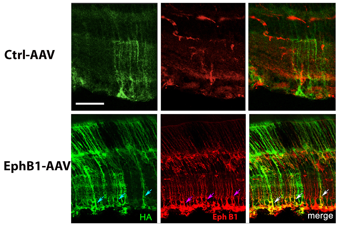 amounts of either the EphB1 overexpression AAV or control AAV. The left panel (green) shows HA staining (as a control), the