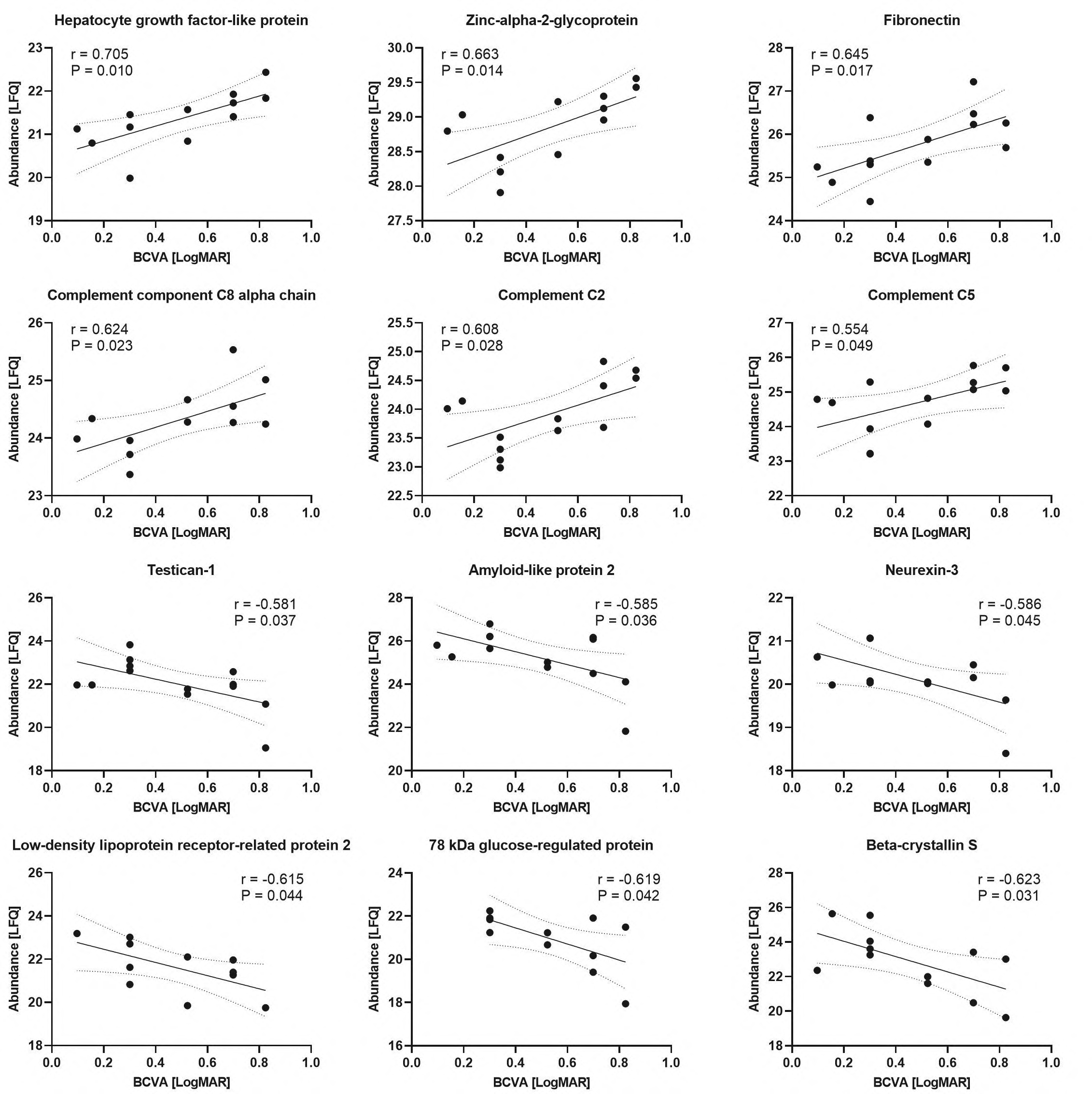 line with 95% confidence bands (dotted line) is shown. Protein levels are presented as log2-transformed label-free quantification units (LFQ); BCVA values are log10-transformed. Pearson’s correlation coefficient (r) and p values (P) are given, with p < 0.05 being statistically significant.