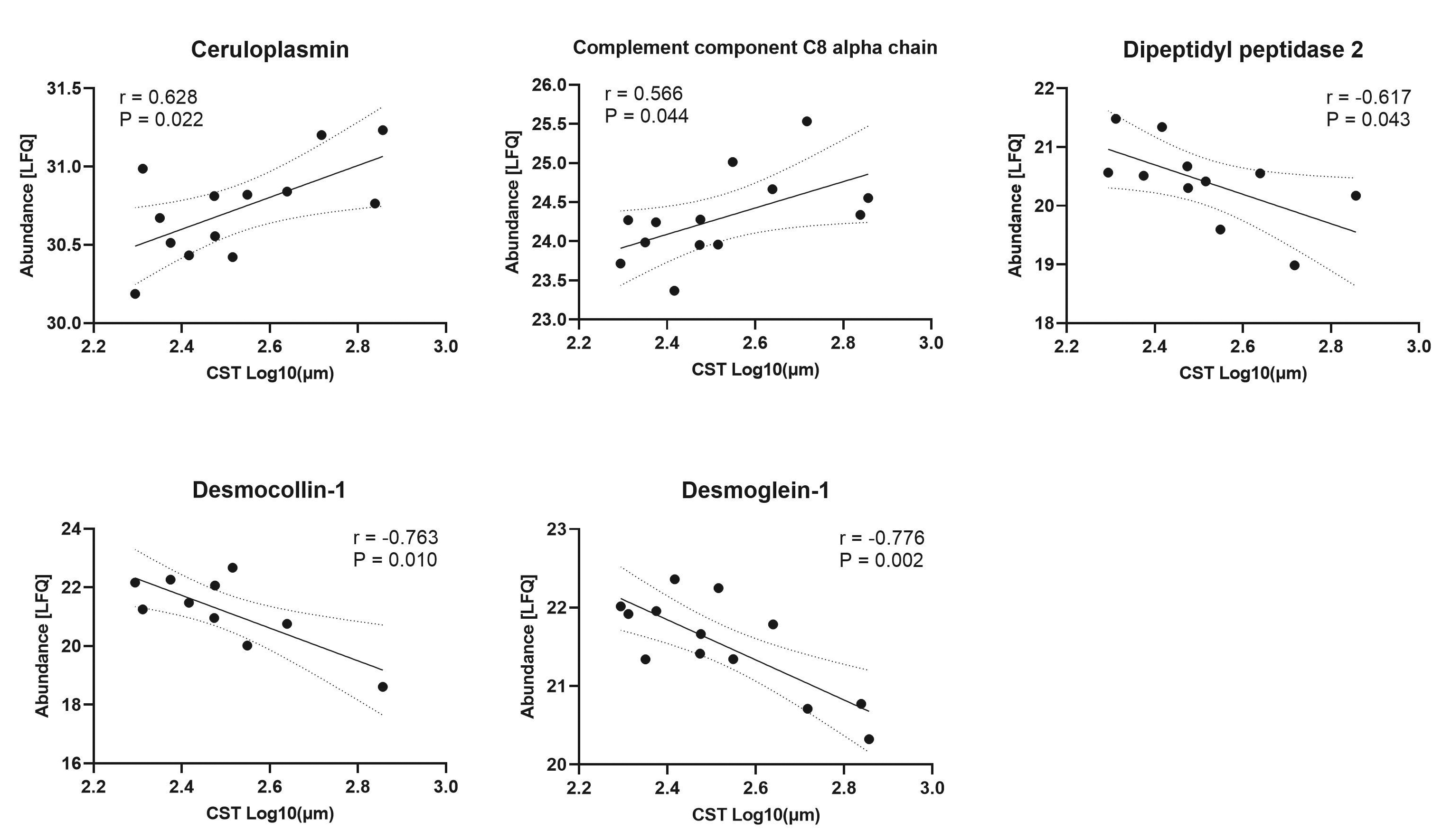95% confidence bands (dotted line) is shown. Protein levels are presented as log2-transformed label-free quantification units (LFQ); CST values are log10-transformed. Pearson’s correlation coefficient (r) and p values (P) are given, with p < 0.05 being statistically significant.
