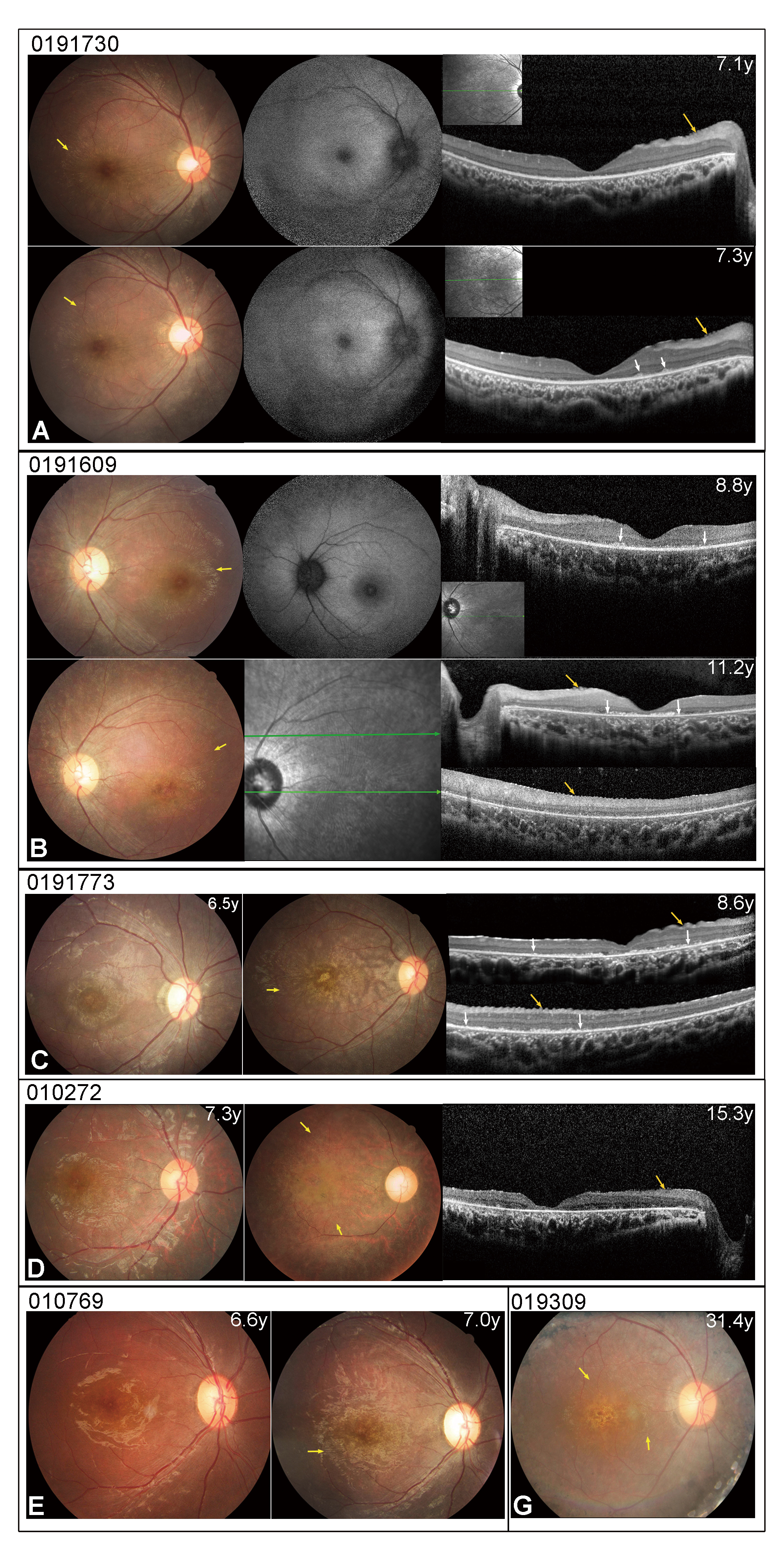 Figure 2. CF, FAF, IRI, and OCT images of patients carrying CLN3 variants. A-G: CF images showed macular atrophy, macular striation, and retinal degeneration (RD) in all the patients. OCT scans in four