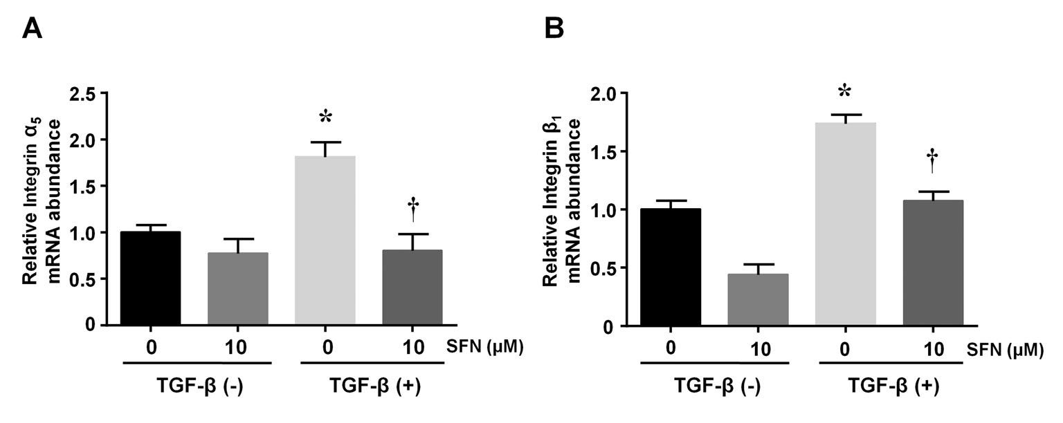 α5, β1 mRNA in differentially treated cells. Data are presented as mean ± SD (n=3). *p<0.05 compared to controls. †p<0.05