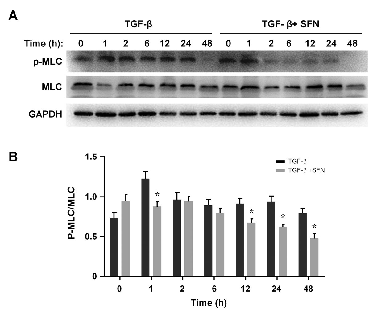 Figure 5. SFN suppresses TGF-β-induced MLC phosphorylation in HTFs. (A) After a 24-h culture followed by a 24-h starvation, cells were