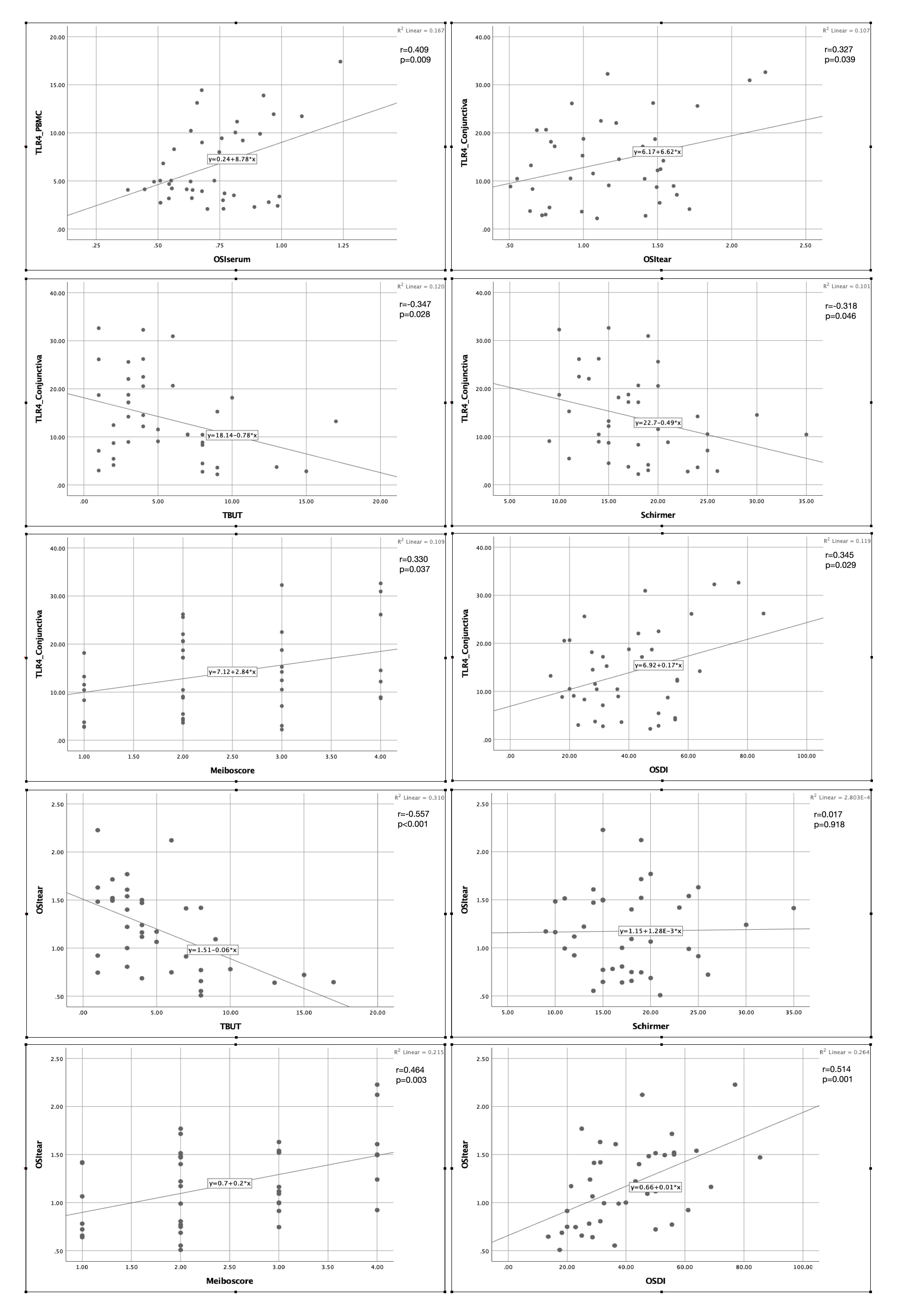 conjunctival epithelium TLR-4, tear OSI, and meiboscore and between conjunctival epithelium TLR-4, tear OSI, and OSDI score,
