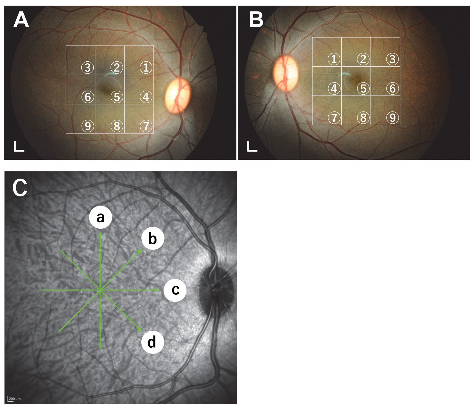 in OCT. A: Right eye showing sites for WD distribution. B: Left eye showing sites for WD distribution. C: Assessment regions for counting hyperreflective granules (the image represents the right eye). The numbers of hyperreflective
