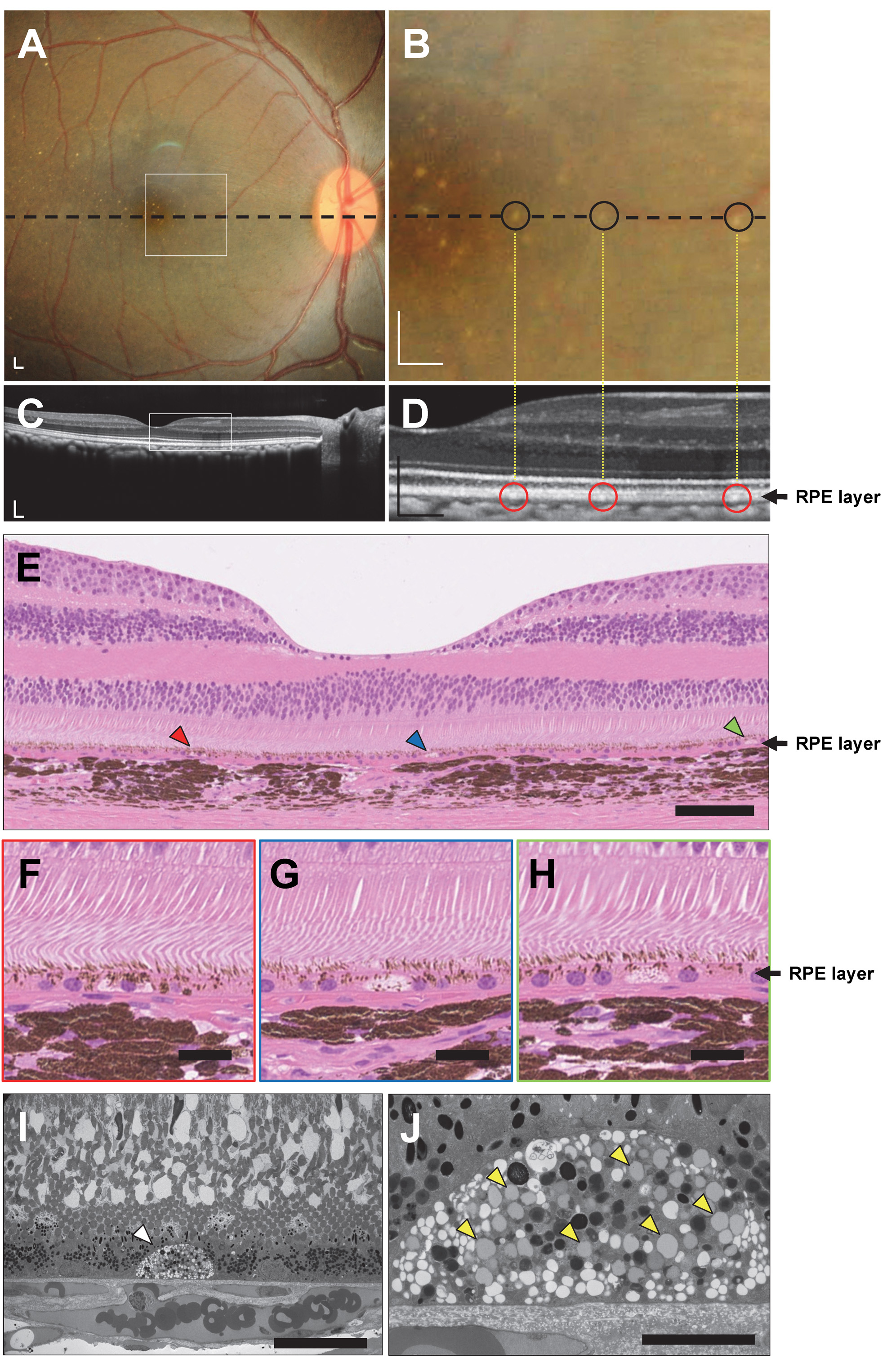 Figure 4. Comparison of the examination results of the macula of the right eye (No. 19: CM). A: Color fundus image, (B) enlarged image of white frame in A, (C) OCT image, (D) enlarged image of white frame in C. At the position where WDs (black circle) are seen in B in the SLO fundus image, hyperreflective lesions (red circles) in the RPE layer are seen in the OCT image (C and D). The black dashed line represents the cutting plane of OCT. E–H: HE-stained sections in and around the fovea. (I, J) Electron microscopic sections of RPE in H. Arrowheads in I indicate vacuolization with microgranules in the RPE cell. F–H: Enlarged image of three arrowheads in E. J: Enlarged image of arrowhead in I. Structures resembling lysosomes (arrowheads) are present in the cytoplasm; these vacuoles are found only in the macula.