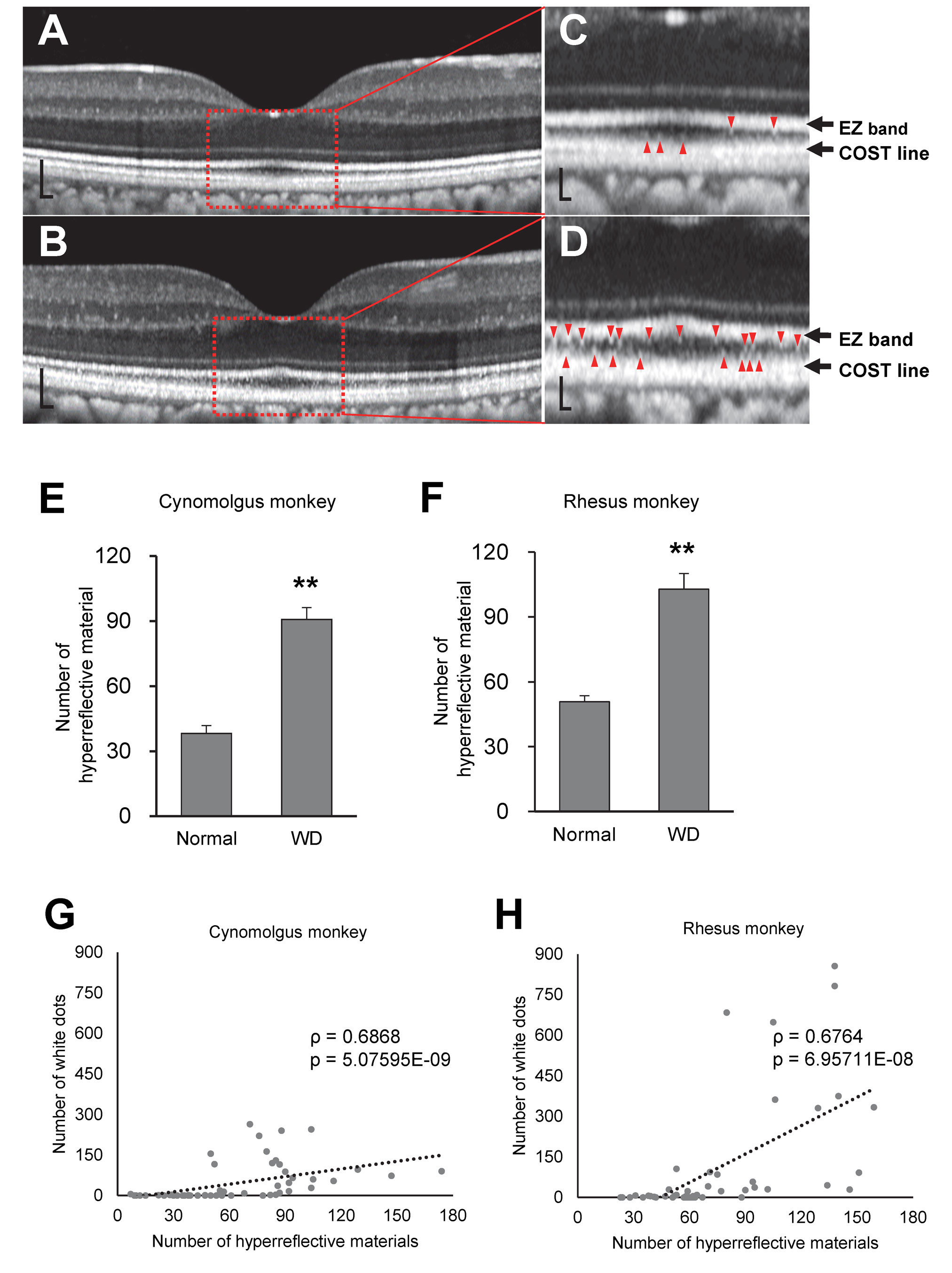 normal animals, but a significantly larger quantity is seen in animals with WDs in fundus examinations. **p < 0.01 versus normal (CM: normal: n = 30, WD: n = 26; RM: normal: n = 28, WD: n = 22; Student’s t-test). WD: WD in macula, n: number of eyes. G, H: Correlation diagrams between the number of hyperreflective granules and the number of WDs for CMs and RMs. A positive correlation