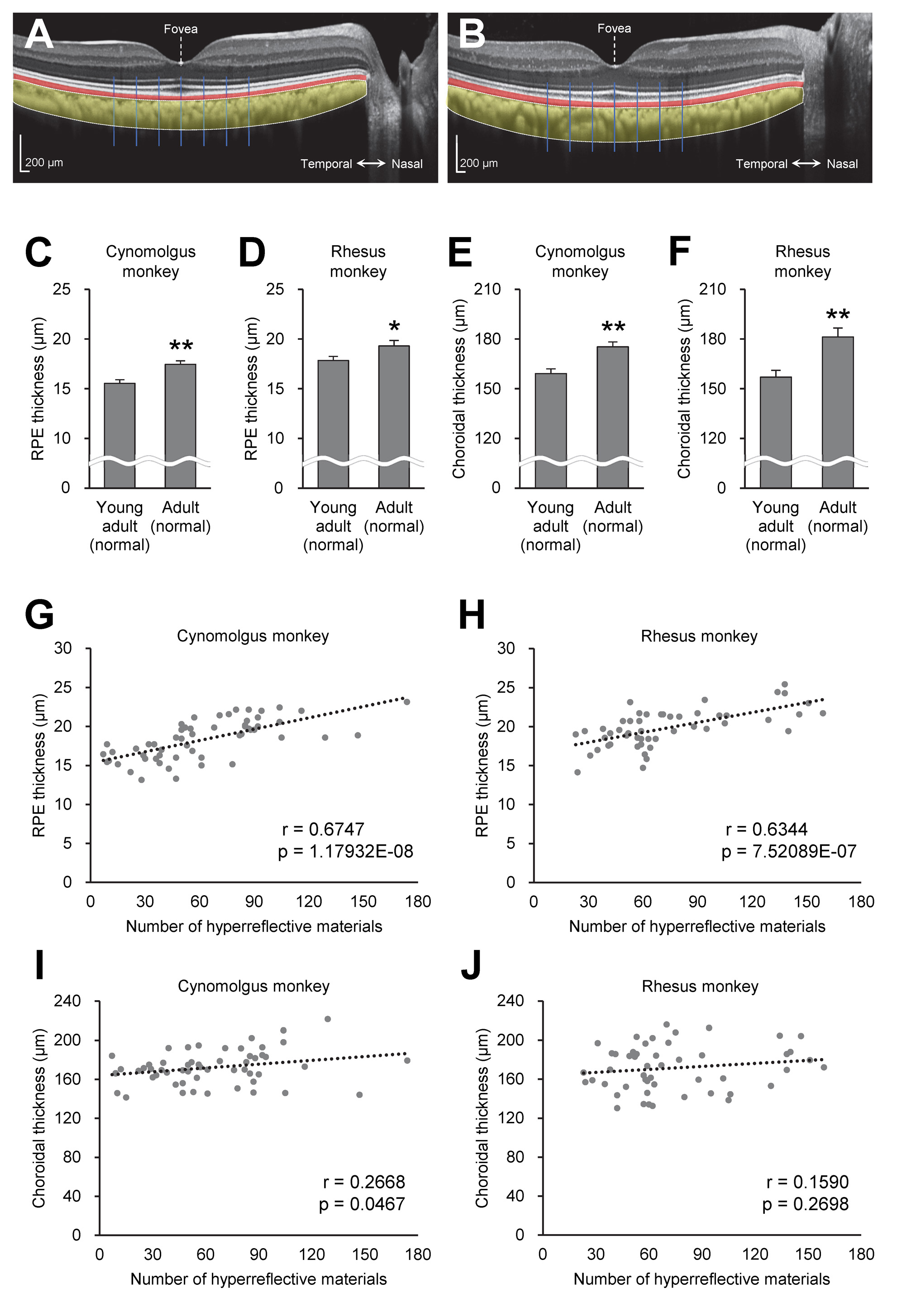 site for RPE thickness. C–F: Graphs showing the mean RPE thickness. (C, E) CMs. D, F: RMs. *p < 0.05, **p < 0.01 versus normal (CM: normal: n = 30, WD: n = 26; RM: normal: n = 28, WD: n = 22, Student’s t-test) in C and D. **p < 0.01 versus young normal (CM: young: n = 16, adult: n = 14; RM: young: n = 18, adult: n = 10, Student’s t-test) in E and F. WD: WD in macula, young: under 10 years old, adult: 10 years old or more, n: number of eyes. G, H: Correlation diagrams between the number of hyperreflective granules and RPE thickness for CMs and RMs. I, J: Correlation diagrams between the number of hyperreflective granules and choroidal thickness for CMs and RMs. A positive