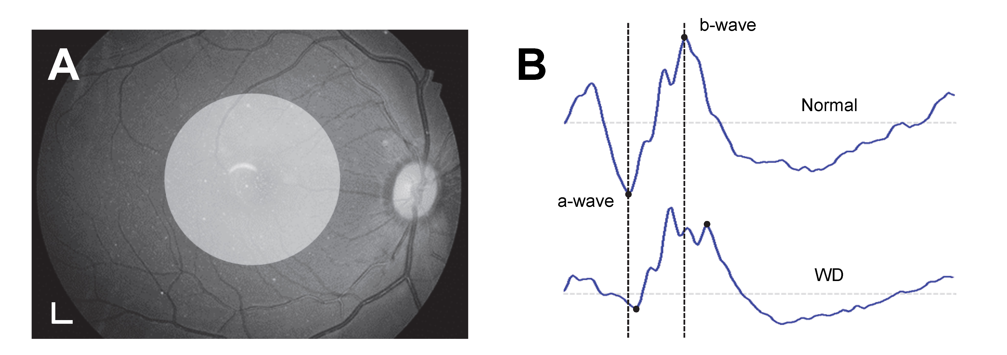 : Representative a-and b-waves in the f-ERG examination for the right eye of CN monkeys, upper: normal (No. 7), lower: WD (No. 19).
