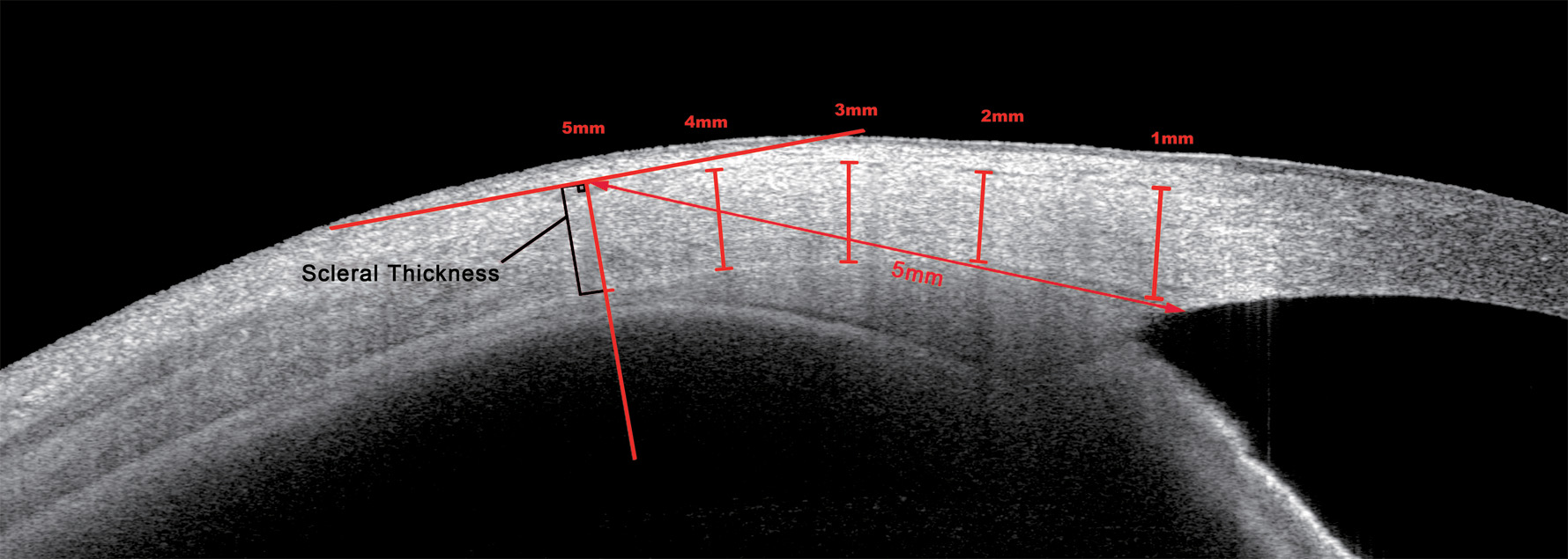 Measurement protocol of scleral thickness. The scleral thickness is measured vertically 1–5 mm posterior to the scleral spur.