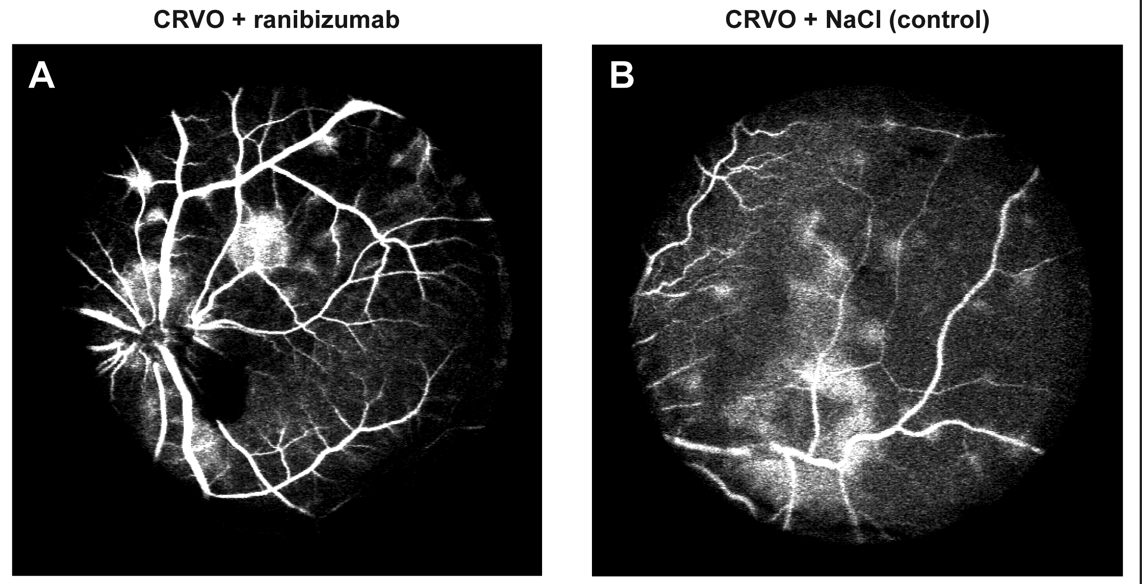 Fluorescein angiography was shown for one eye treated with ranibizumab and one eye treated with NaCl.