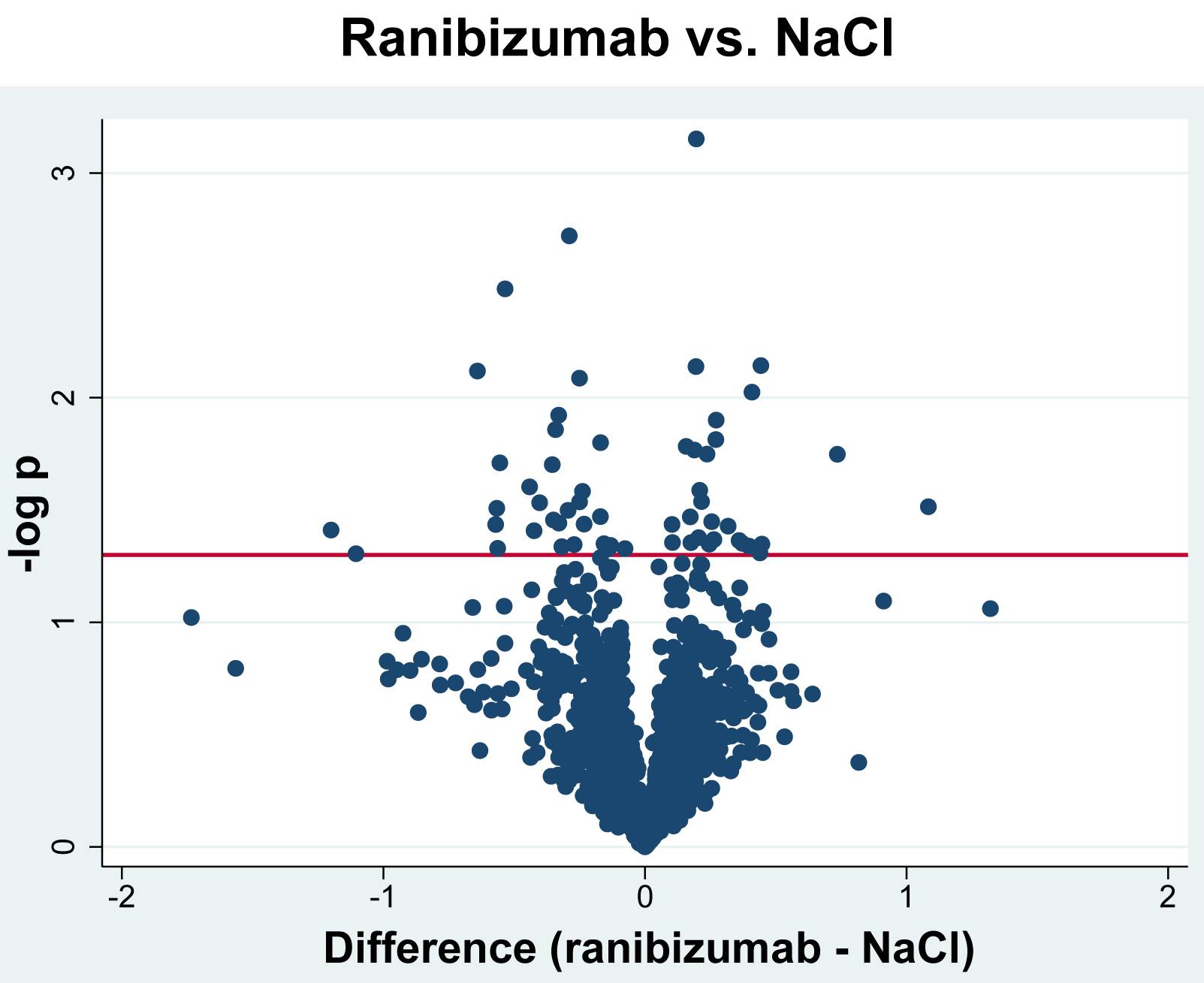 Figure 3. Volcano plot. The log2-transformed abundance ratio (ranibizumab/NaCl) for each protein is plotted on the x-axis. Negative