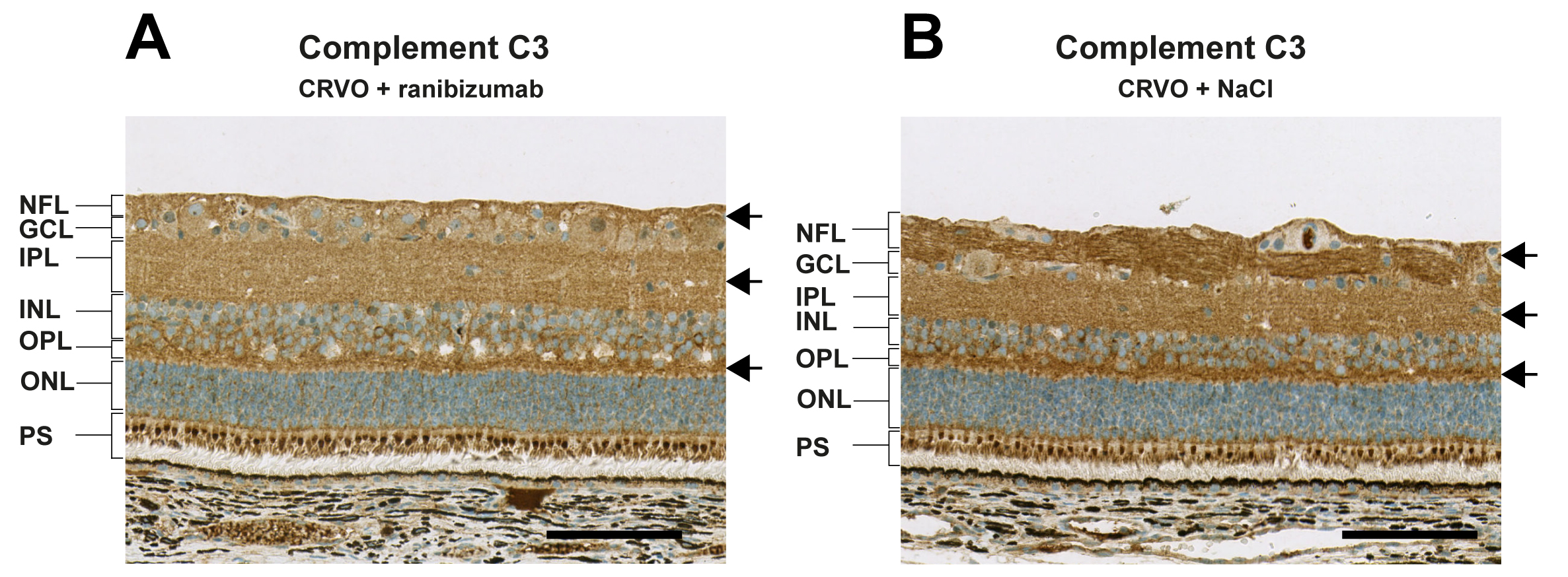 Figure 5. Immunohistochemistry. A and B: Complement C3 was predominantly expressed in the retinal nerve fiber layer, inner plexiform layer, outer plexiform layer,