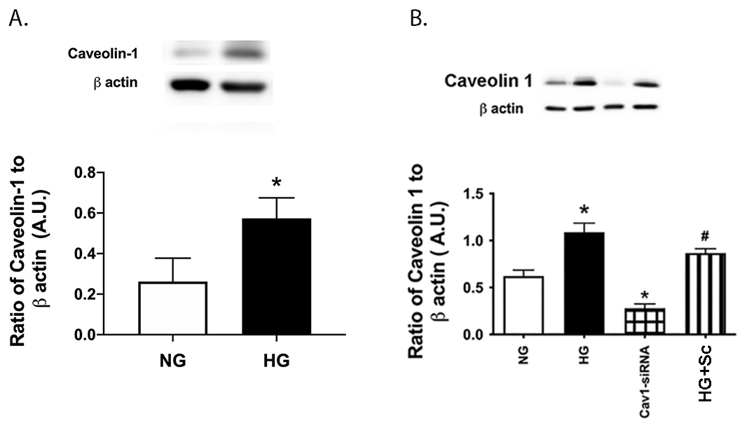Figure 2. High glucose increased Cav1 in retinal endothelial cells (RECs). Panel A shows Cav1 levels in RECs grown in normal glucose (NG) or high glucose (HG). Panel B shows Cav1 levels in RECs grown in NG, HG, HG+Cav1 siRNA (Cav1 siRNA), or HG+scrambled siRNA (HG+Sc). Arbitrary units (A.U.);