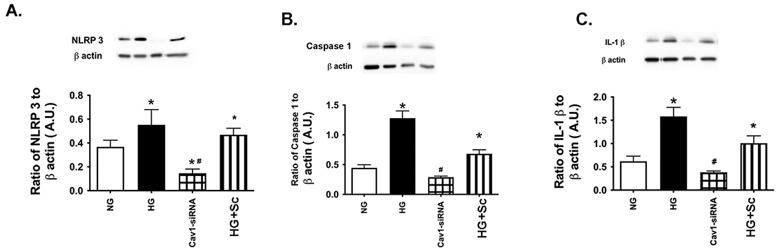 siRNA (Cav1 siRNA), and HG+scrambled siRNA (HG+Sc). Panel A shows NLRP3, Panel B shows cleaved caspase 1, and Panel C shows IL-1β protein levels. Arbitrary units (A.U.); *p <.05 versus NG; #p <.05 versus HG; n = 5. Data are mean±SEM.