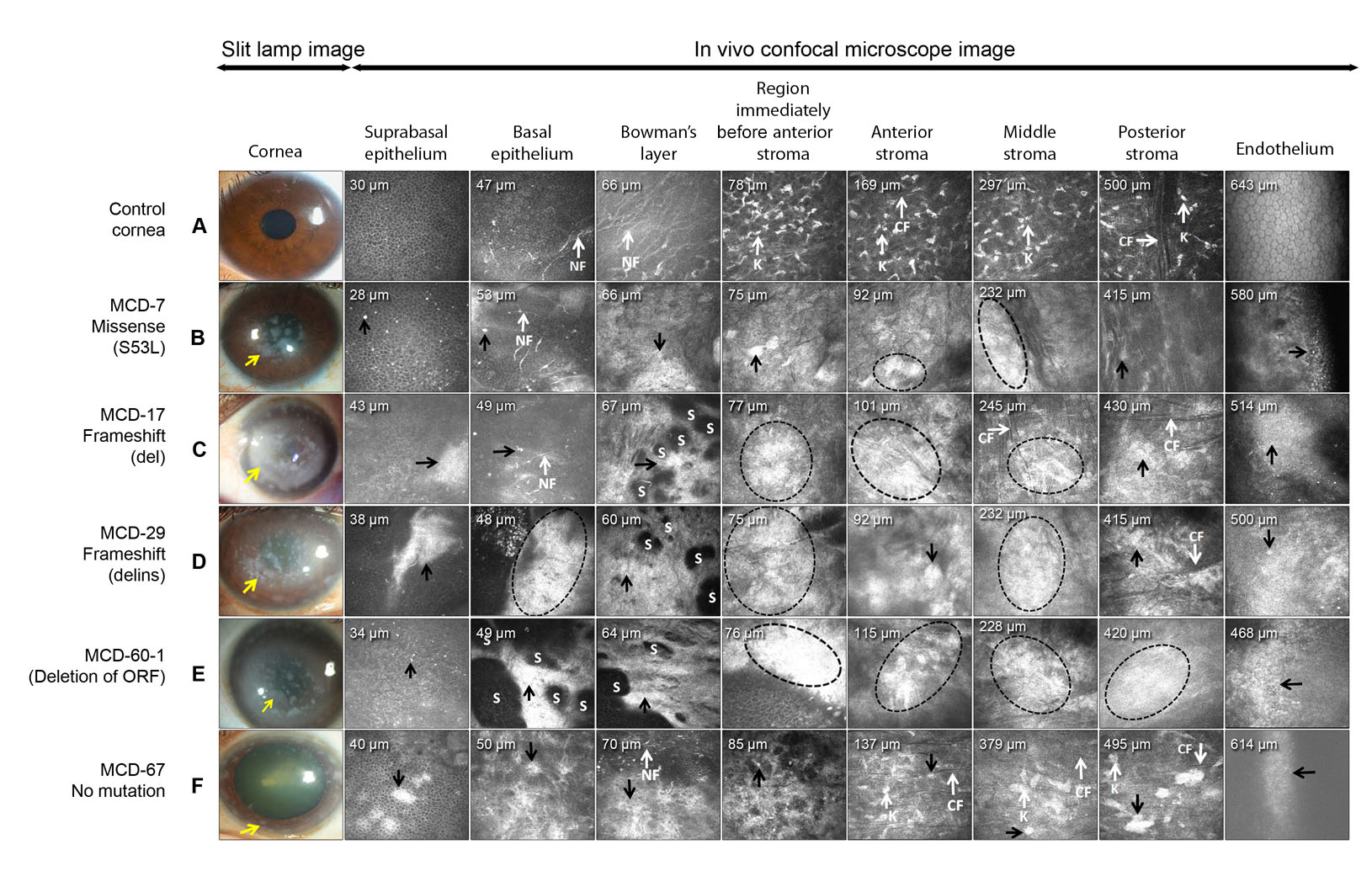 material with dark striae (St)-like images was observed throughout the stroma (for patients B-F). Striae-like observations were not clearly visible due to the highly light-reflective clumps of deposits (E). Clinical and IVCM analysis across the corneal thickness of MCD patients 17 (C), 29 (D), and 60–1 (E) carrying fs deletion (del), deletion-insertion (delins), and deletion of ORF mutations, respectively, revealed severe scars