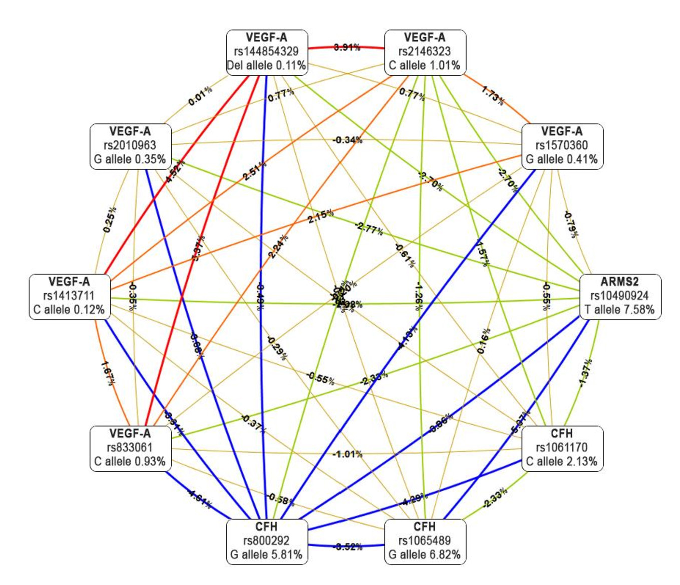 Figure 1. Entropy-based SNP-SNP interaction network of 10 polymorphisms of the genes in the case and control groups. The percent of