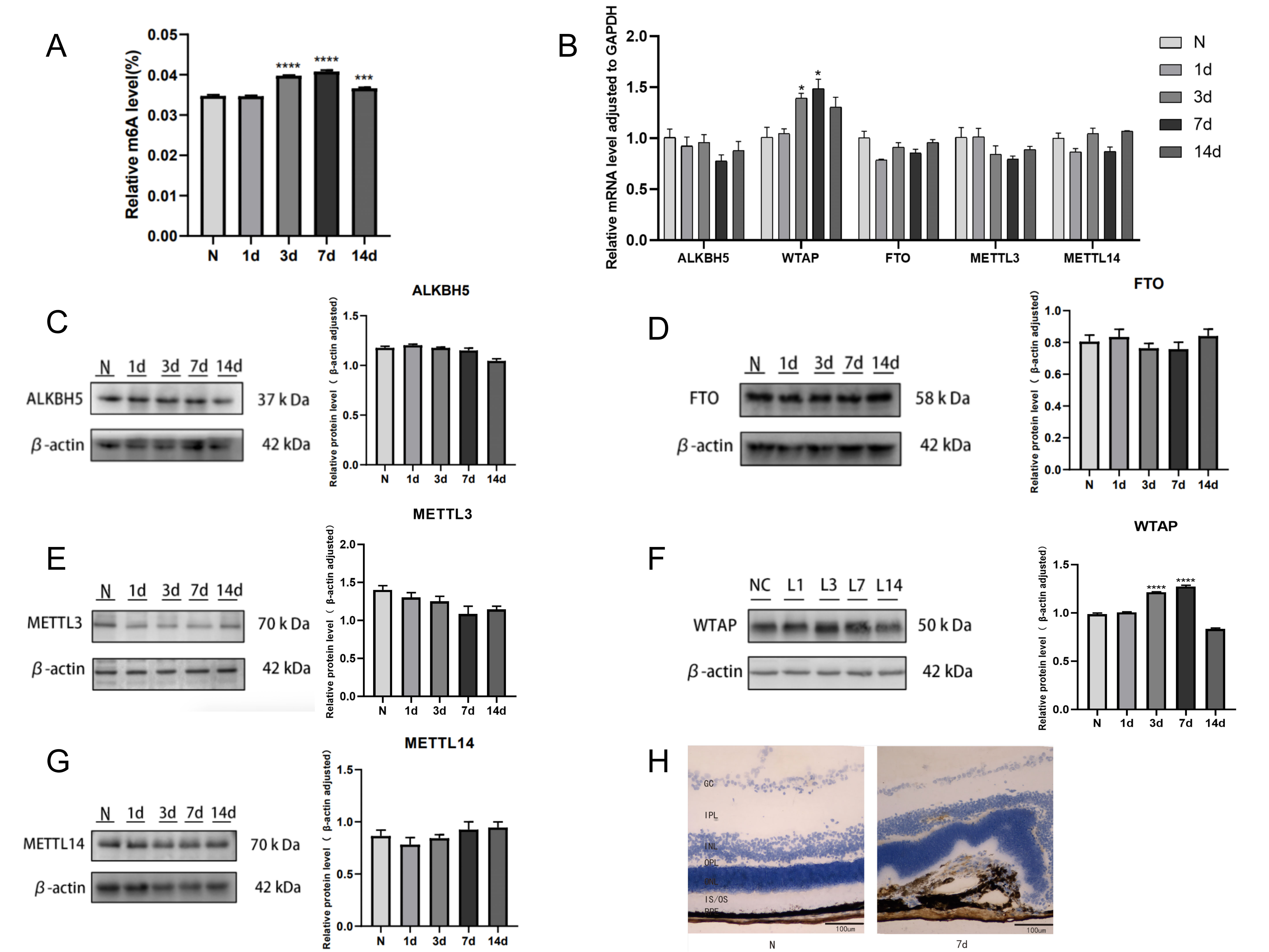 Figure 1. m6A modification levels and WTAP expression increased after laser photocoagulation. A: Quantitative analysis of m6A showed a trend in the m6A level compared with the normal control group. B: Using qRT-PCR analysis to detect the expression of ALKBH5, WTAP, FTO, METTL3, and METTL14. Western blot was used to detect