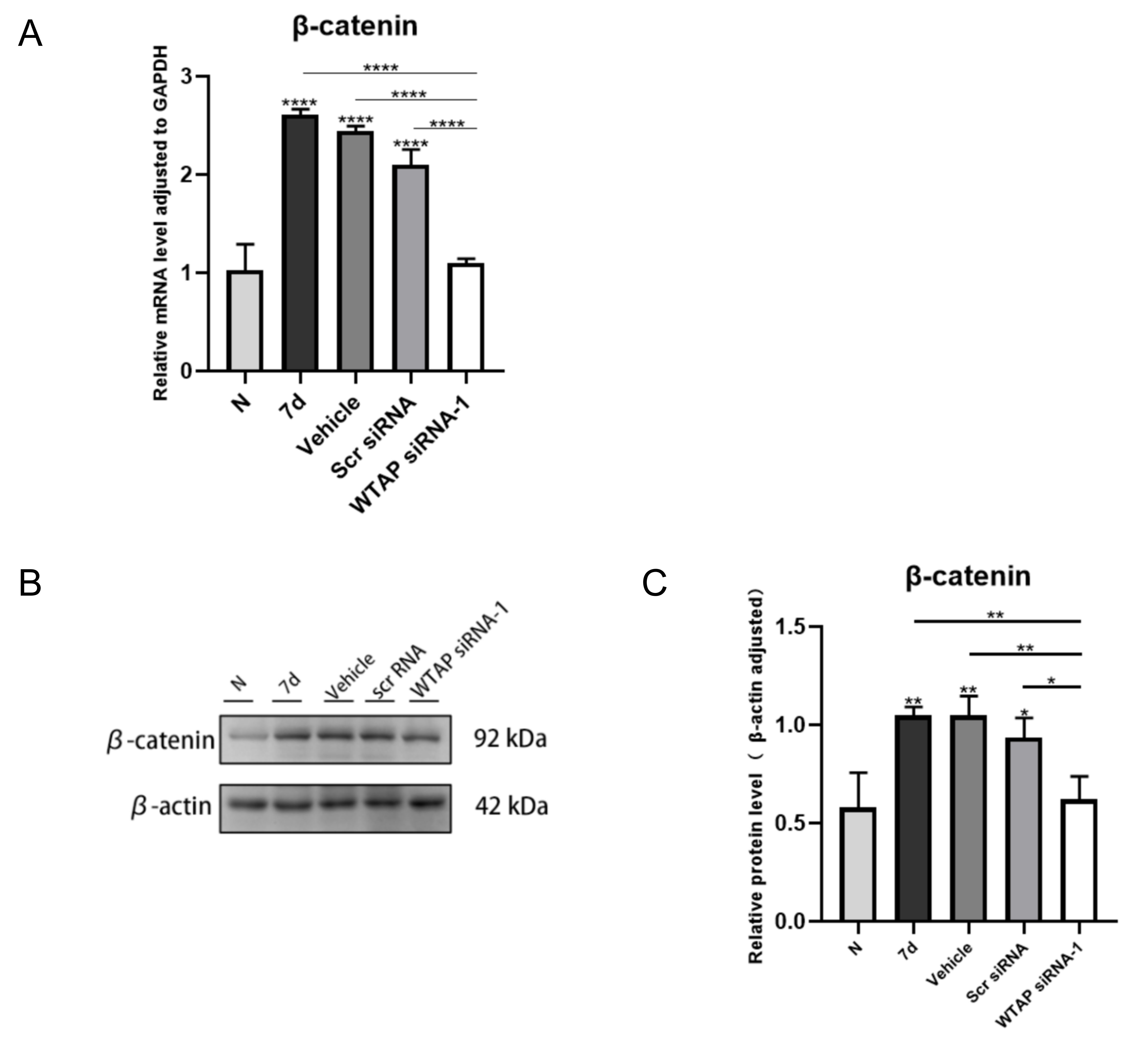 Figure 5. WTAP may affect the MNV pathological process through the Wnt pathway. A: QRT-PCR analysis showed a significant decrease in β-catenin expression after intravitreal injection of WTAP siRNA. B: Using western blot to measure the expression of β-catenin. C: Statistical analysis showing the trend of β-catenin expression.