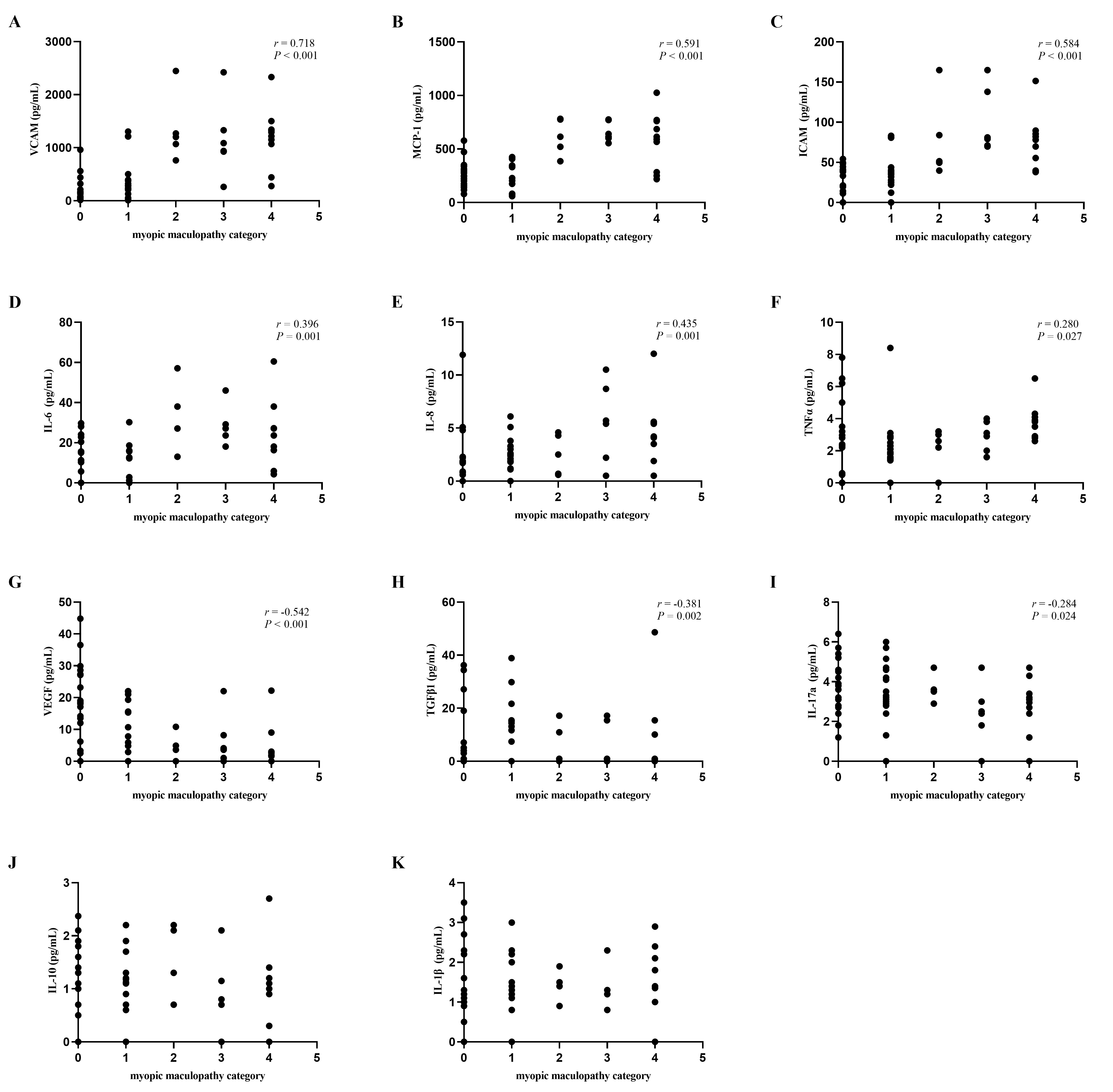 Figure 1. Correlation between cytokine levels in aqueous humor and myopic maculopathy categories. A-F: A positive correlation was shown between myopic maculopathy categories and levels of VCAM (r=0.718, p<0.001), MCP-1(r=0.591, p<0.001), ICAM (r=0.584, p<0.001), IL-6(r=0.396, p=0.001), IL-8(r=0.435, p=0.001), and TNF-α (r=0.280, p=0.027). (G-I) An inverse correlation was observed between VEGF (r=-0.542, p<0.001), TGF-β1(r=-0.381, p=0.002), and IL-17a (r=-0.284, p=0.024) and myopic maculopathy categories. J-K: No correlation was found between IL-1β and IL-10 and myopic maculopathy categories (p>0.05).