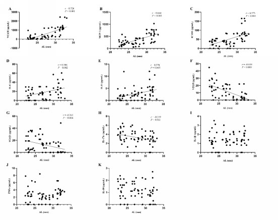 Figure 2. Relationships between levels of cytokines in the aqueous humor and AL. A-E: A positive relationship was found between AL and levels of VCAM (r=0.726, p<0.001), MCP-1(r=0.644, p<0.001), ICAM (r=0.573, p<0.001), IL-6(r=0.386, p=0.002), and IL-8(r=0.376, p=0.002). F-H: An inverse relationship was found between VEGF (r=-0.610, p<0.001), TGF-β1(r=-0.361, p=0.004), IL-17a (r=-0.319, p=0.011), and AL. I-K: No correlation was found between IL-1β, TNF-α, and IL-10 and AL (p>0.05).