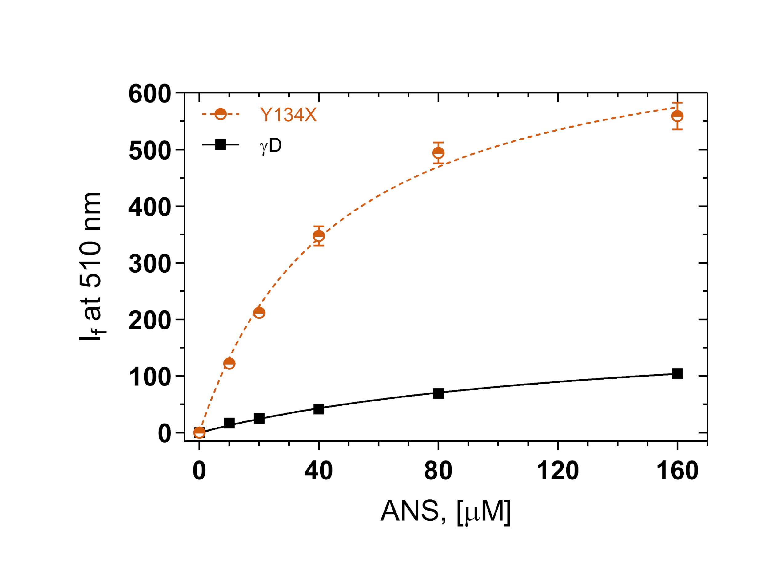 To access the data, click or select the words “Appendix 3.” Surface hydrophobicity measurement of wild-type (black squares) and Y134X mutant human γD-crystallin (brown circles) by ANS. Values represent the mean of three independent experiments of 3 separate samples; error bars indicate the standard deviation. Protein concentration: 6 μM; λex: 390 nm; λem: 510 nm; Excitation emission slits: 5 nm. If: Fluorescence intensity.
