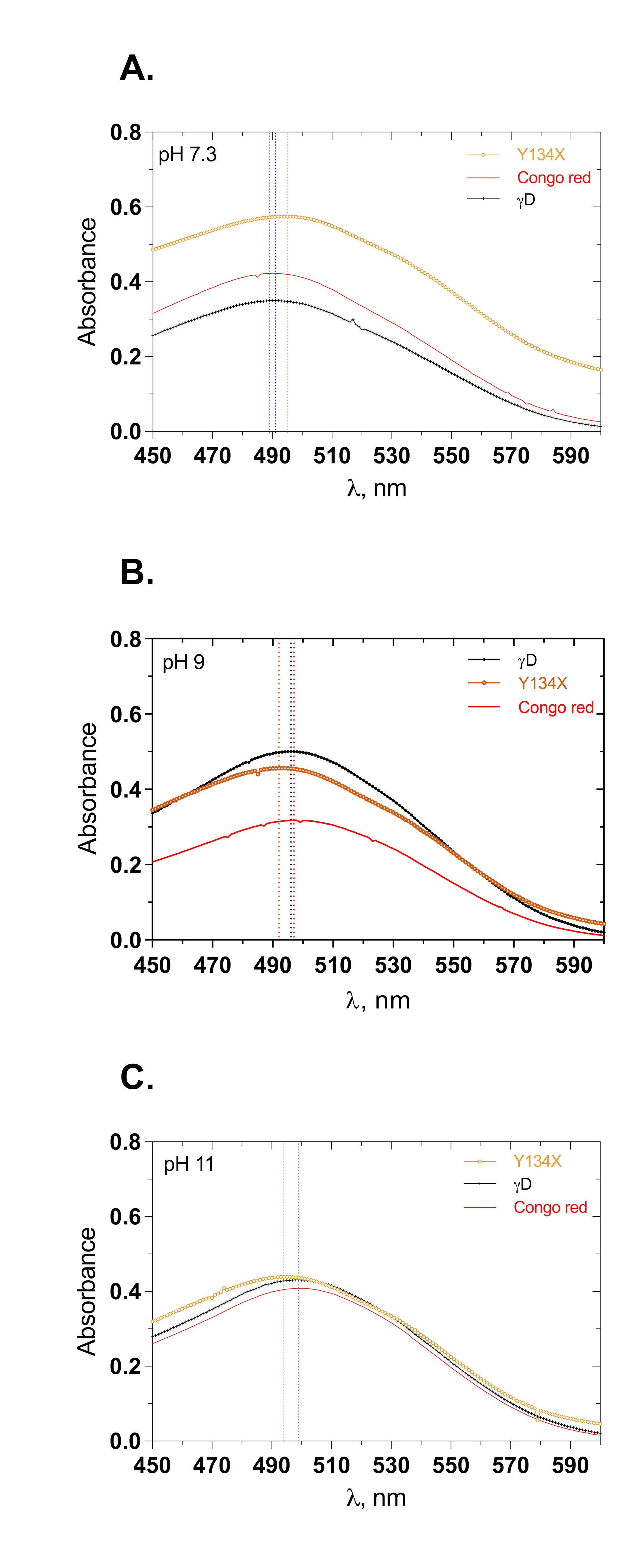 To access the data, click or select the words “Appendix 7.” Congo red absorption spectra of wild-type (black +) and Y134X mutant human γD- crystallin (brown circles). Congo red absorption spectra at A) pH 7.3 B) pH 9 C) pH 11. Each spectrum is an average of 3 independent scans of 3 separate samples. Protein concentration: 9 μM; Cuvette path length: 1 cm.