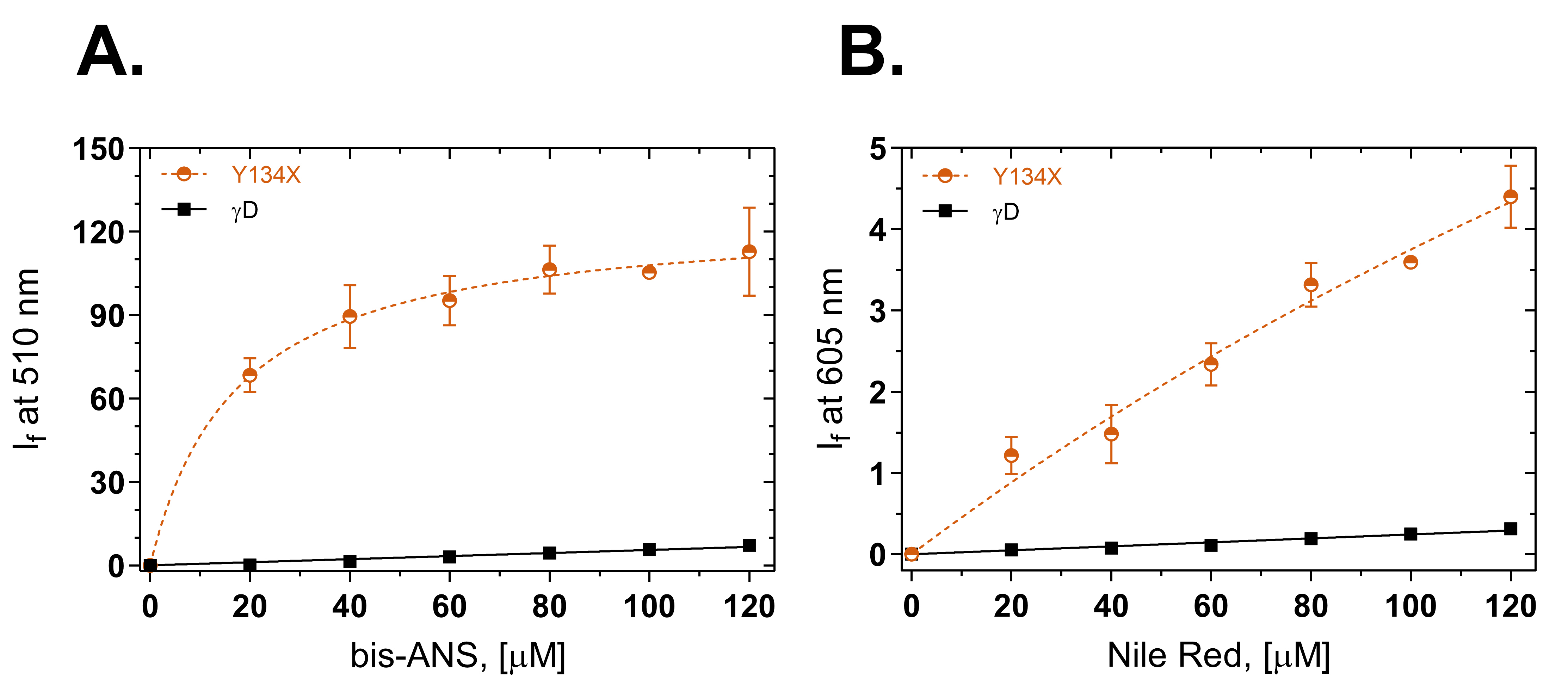 Figure 2. Surface hydrophobicity measurement of wild-type (black squares) and Y134X mutant human γD-crystallin (brown circles). A: bis-ANS spectra. Values represent the mean of three independent experiments; error bars indicate the standard deviation.