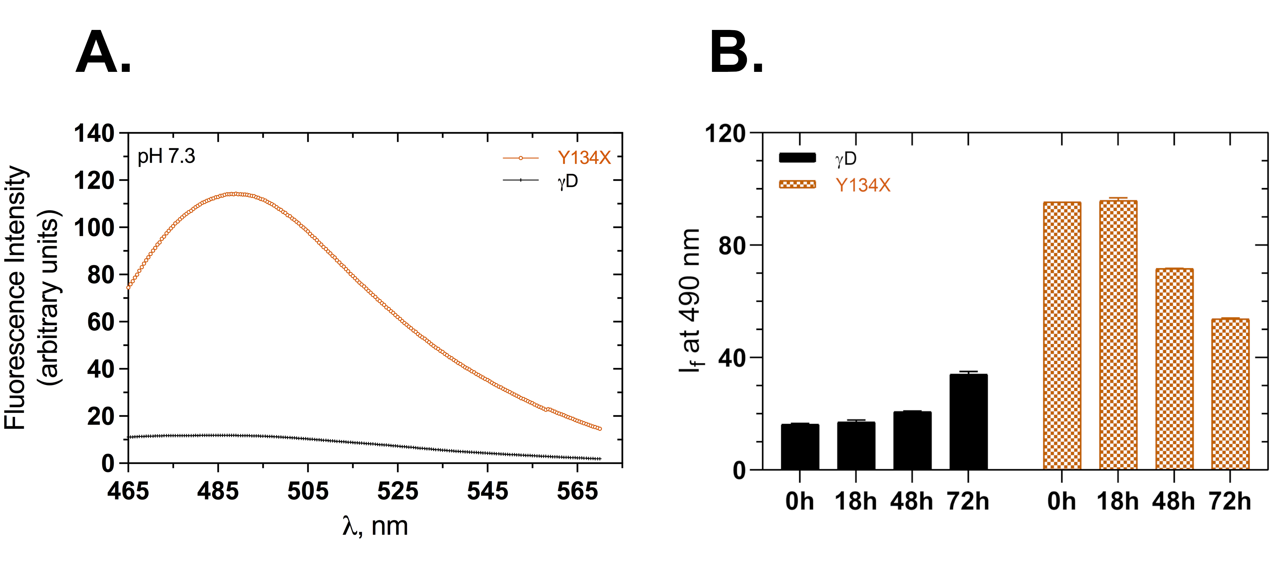 Figure 4. Amyloid fibril detection of wild-type (black +) and Y134X mutant human γD-crystallin (brown circles) using Thioflavin-T. A: Thioflavin-T spectra at pH 7.3. Each spectrum is an average of three independent scans of three separate samples. B: Thioflavin-T fluorescence at pH 7.3 as a function of time. Values represent the mean of three independent experiments of