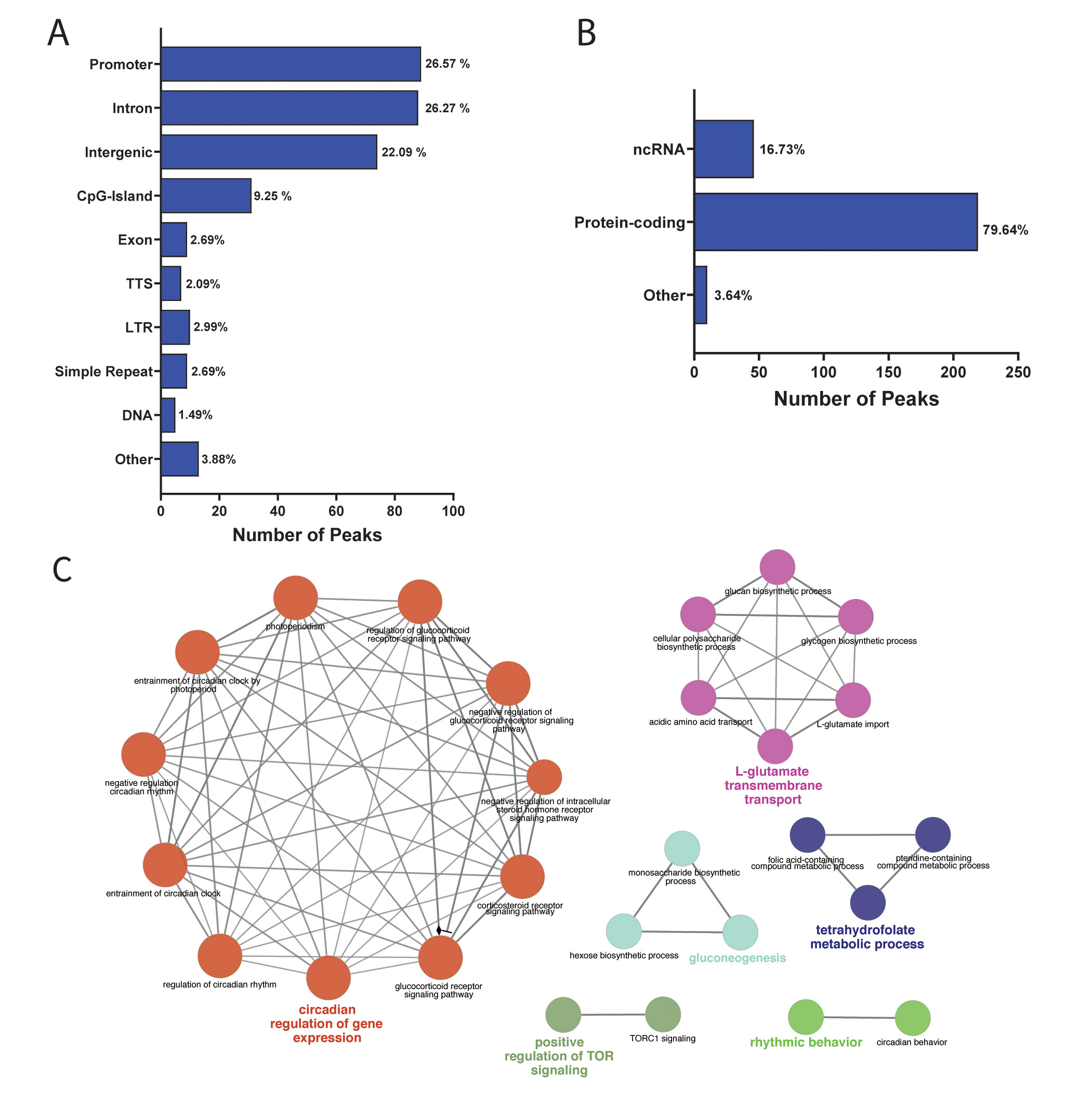 Figure 2. Genomic annotation of the BMAL1 transcription factor. (A) Bar chart showing genomic feature distribution for BMAL1 in human Müller cells, (B) distribution of peaks across transcript region showing enriched peaks for protein-coding and non-coding RNA regions. (C) ClueGo enrichment network illustrating the functional roles associated with the 89 genes with BMAL1 promoter binding sites.