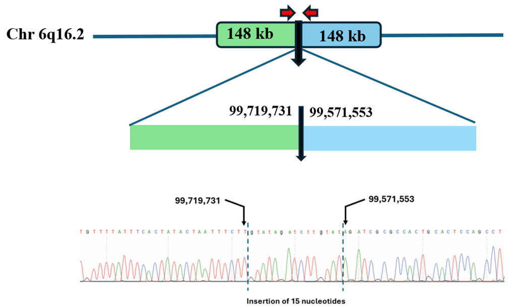 Figure 4. Sanger sequencing validation of duplication breakpoints at 6q16.2. The proband (II-1) and all available affected relatives