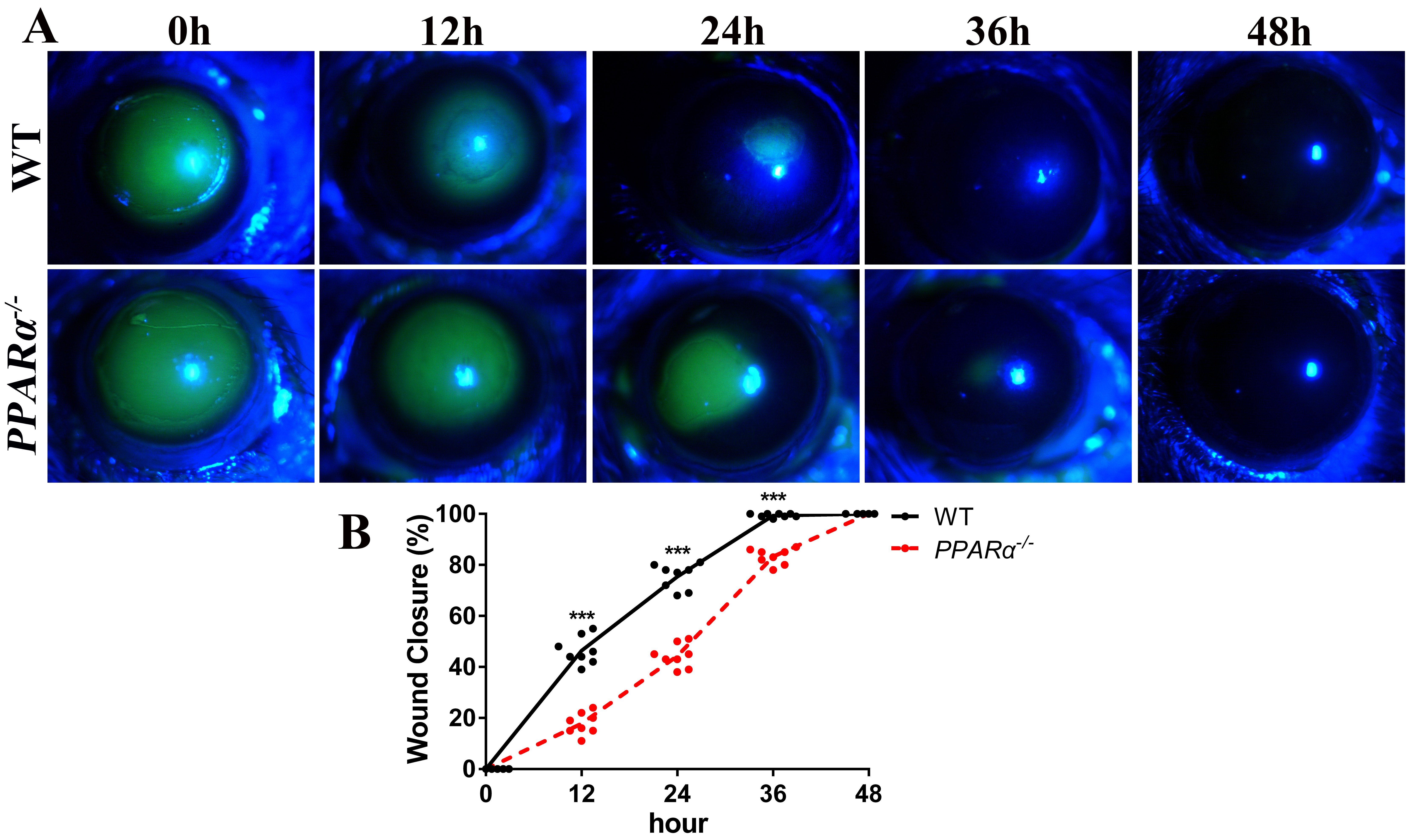Figure 3. Corneal epithelial wound healing in PPARα−/− mice. Representative slit-lamp images (A) and wound closure analysis (B) show the fluorescein staining area in WT mice compared to PPARα−/− mice at different time points (0/12/24/36/48 h). Data are shown as mean ± SD n=6–8, ***p<0.001.
