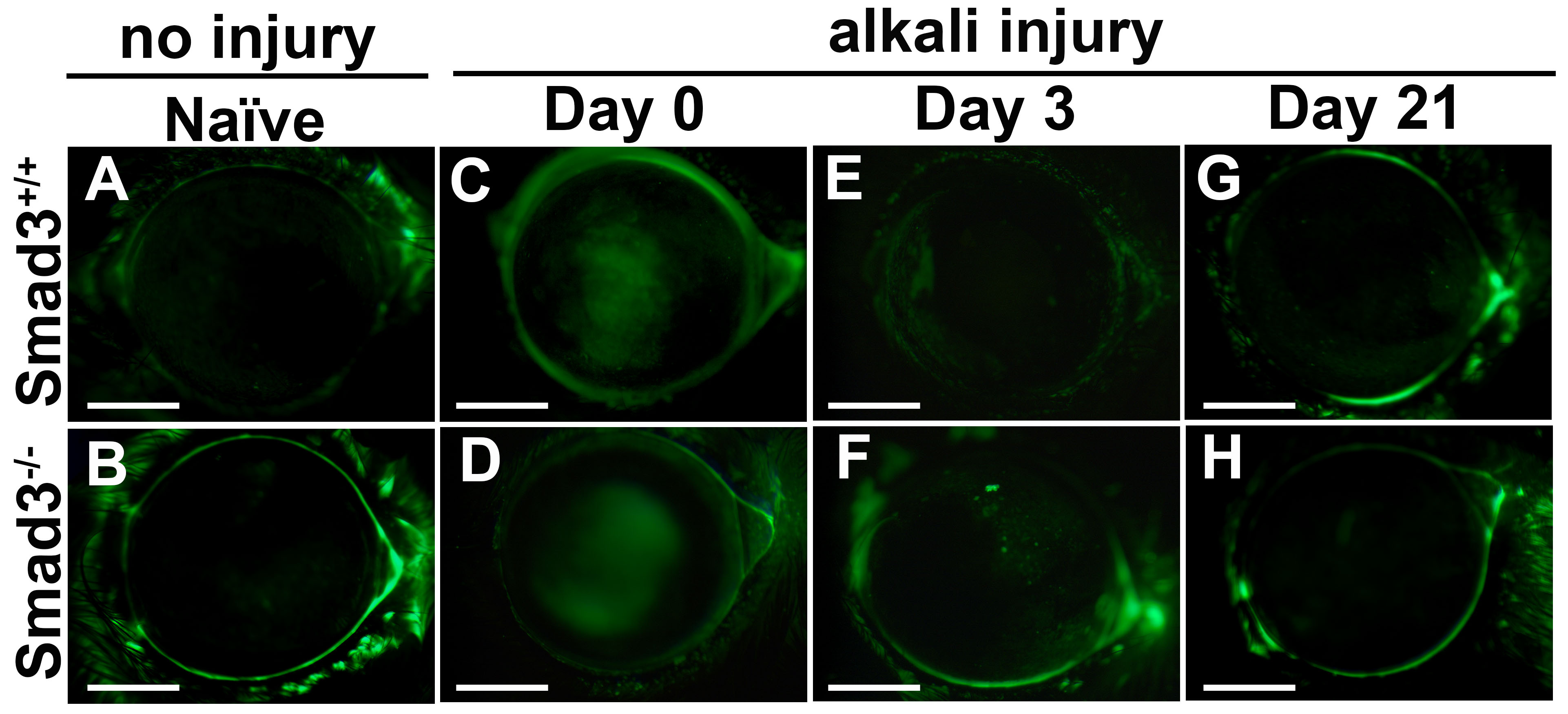 strains of Smad3+/+ and Smad3−/− naïve and alkali-injured corneas in a time-dependent manner. Scale bar = 0.5 mm.