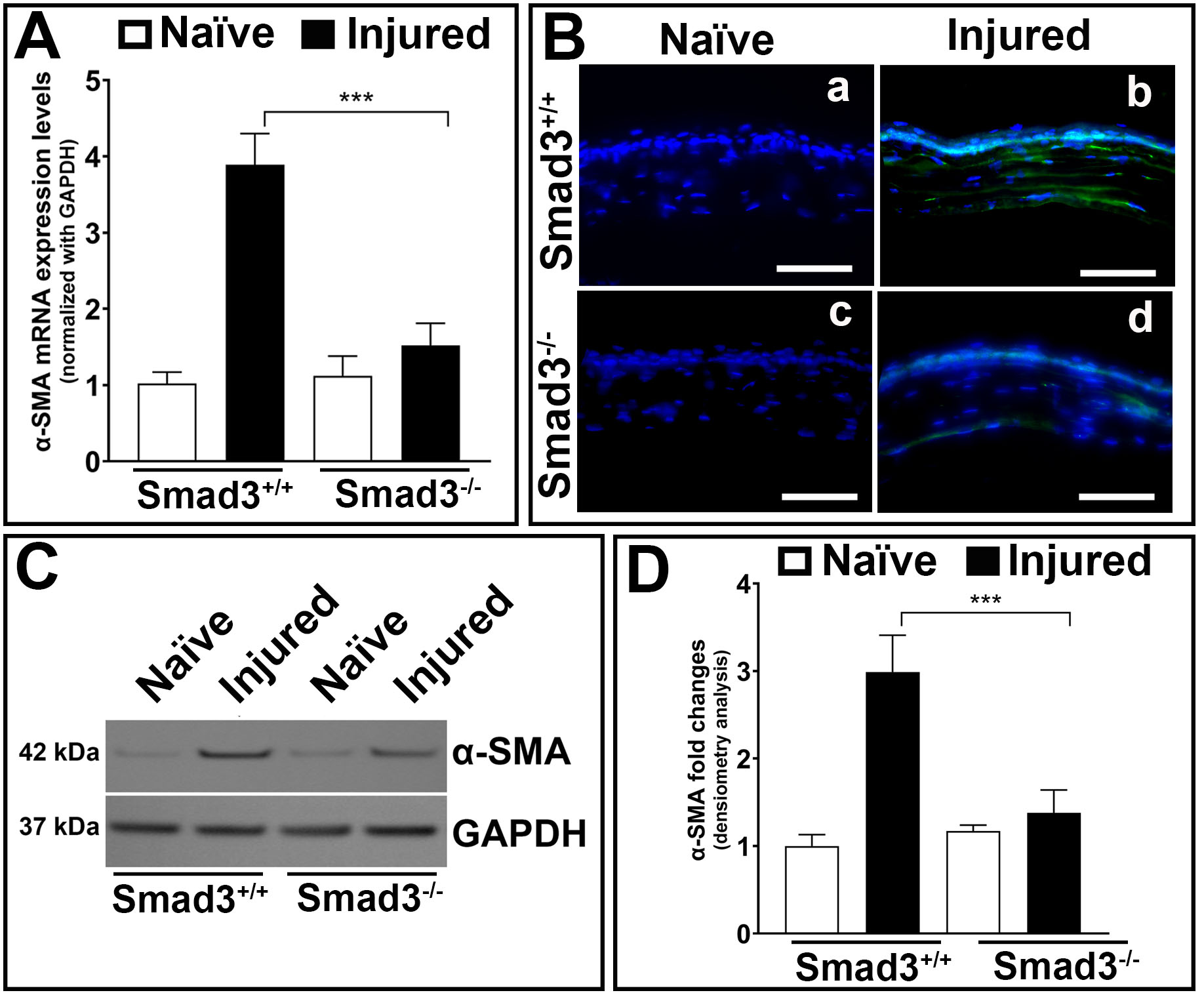 Figure 6. Smad3 gene deficiency regulates the stromal ECM protein modulation during fibrosis in mice after alkali injury. A: The comparative mRNA expression of α-SMA (fibrosis marker) was significantly downregulated in Smad3−/− mouse corneal tissue compared with Smad3+/+ mouse corneal tissue after alkali injury. B: The immunofluorescence staining of α-SMA was prominently reduced in Smad3−/− mouse corneal tissue compared with Smad3+/+ mouse corneal tissue after alkali injury, whereas no changes were recorded in both Smad3+/+ and Smad3−/− mouse naïve corneal tissue sections. C: The western blot images showed that the α-SMA protein level was notably abridged in Smad3−/− mouse corneal tissue compared with Smad3+/+ mouse corneal tissue after alkali injury, whereas no changes were recorded in both Smad3+/+ and Smad3−/− mouse naïve corneal tissue sections. D: The western blot densitometry analysis graph shows a significant reduction in fibrosis level in Smad3−/− mouse corneas compared with Smad3+/+ mouse corneas. The results are expressed as mean ± SEM, and p<0.05 was considered significant. Scale bar = 200 µm.