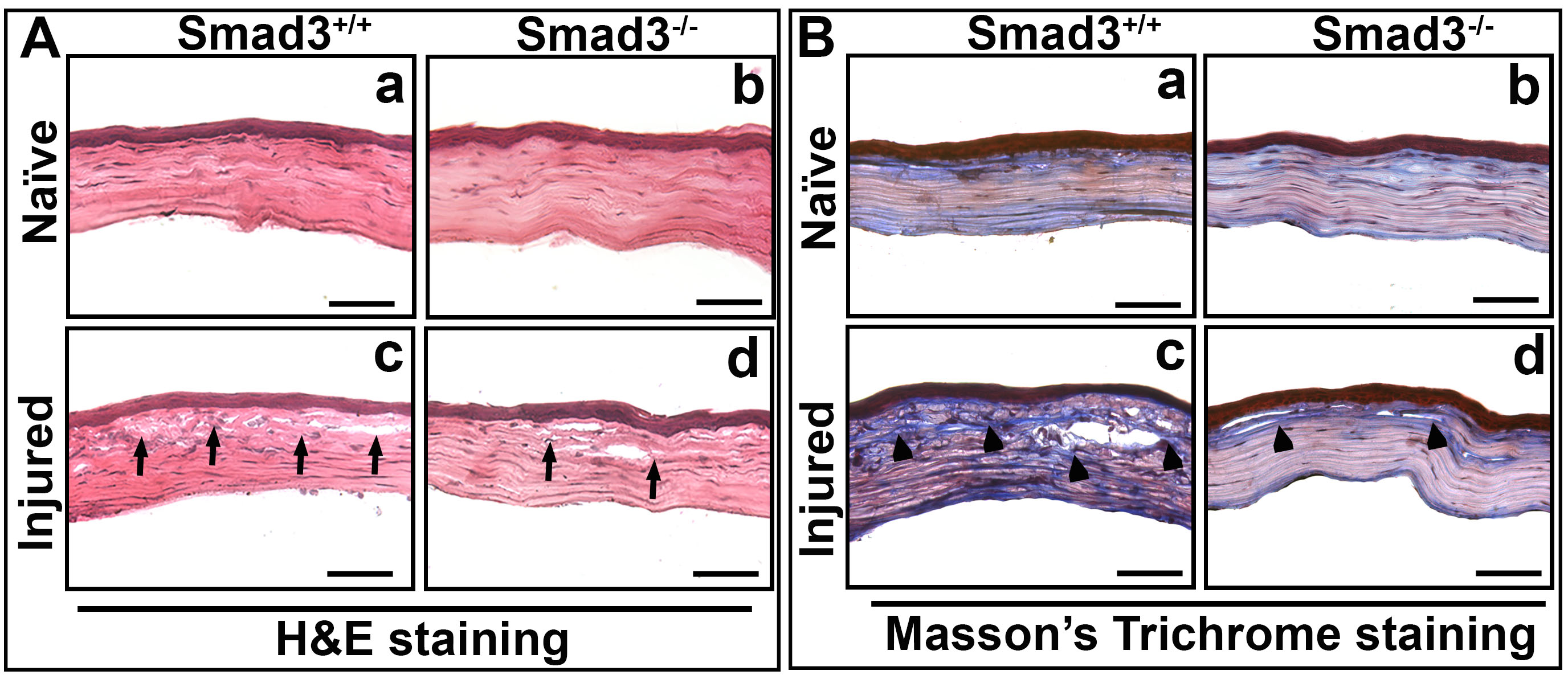 injury during active wound healing. A: H&E staining showing the morphological architecture of Smad3+/+ naïve (a); Smad3−/− naïve (b); Smad3+/+ post-alkali injury (c); and Smad3−/−- post-alkali injury (d) corneal tissue sections at day 21. No structural changes were observed in Smad3−/− and Smad3+/+ naïve corneal tissue sections. An increased cellular infiltration and distorted collagen lamellae (arrows) were observed