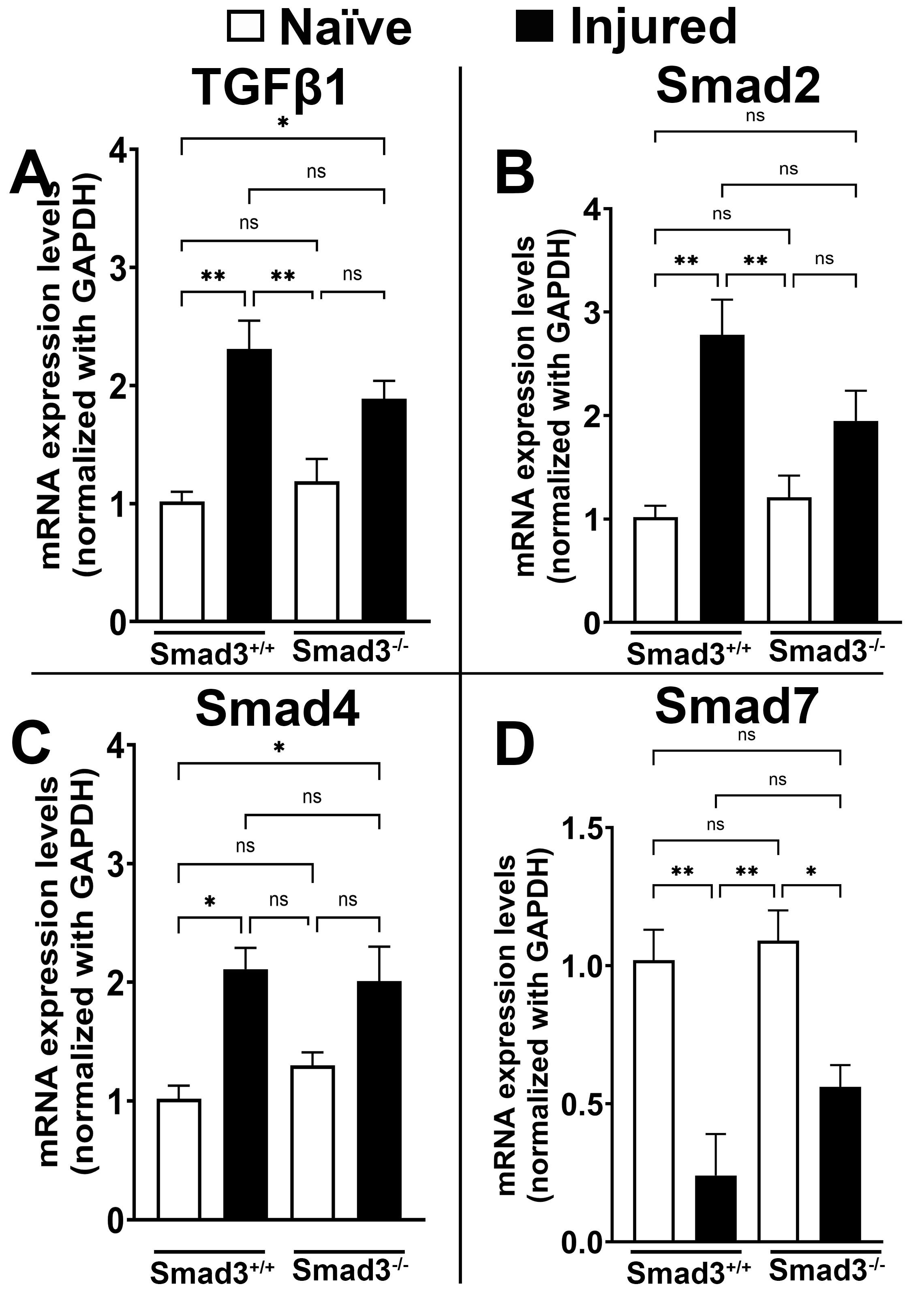 Figure 8. Effects of Smad3 gene deficiency in TGFβ/Smad signaling in mice after alkali injury. A: TGFβ1 (p<0.001); B: Smad2 (p<0.01); C: Smad4 (p<0.05); and D: Smad7 comparative mRNA expression significantly altered in post-alkali injury tissue at day 21 in both Smad3+/+ and Smad3−/− strains as compared with corresponding naïve control mouse corneal tissue. Results are expressed as mean ± SEM, and p<0.05