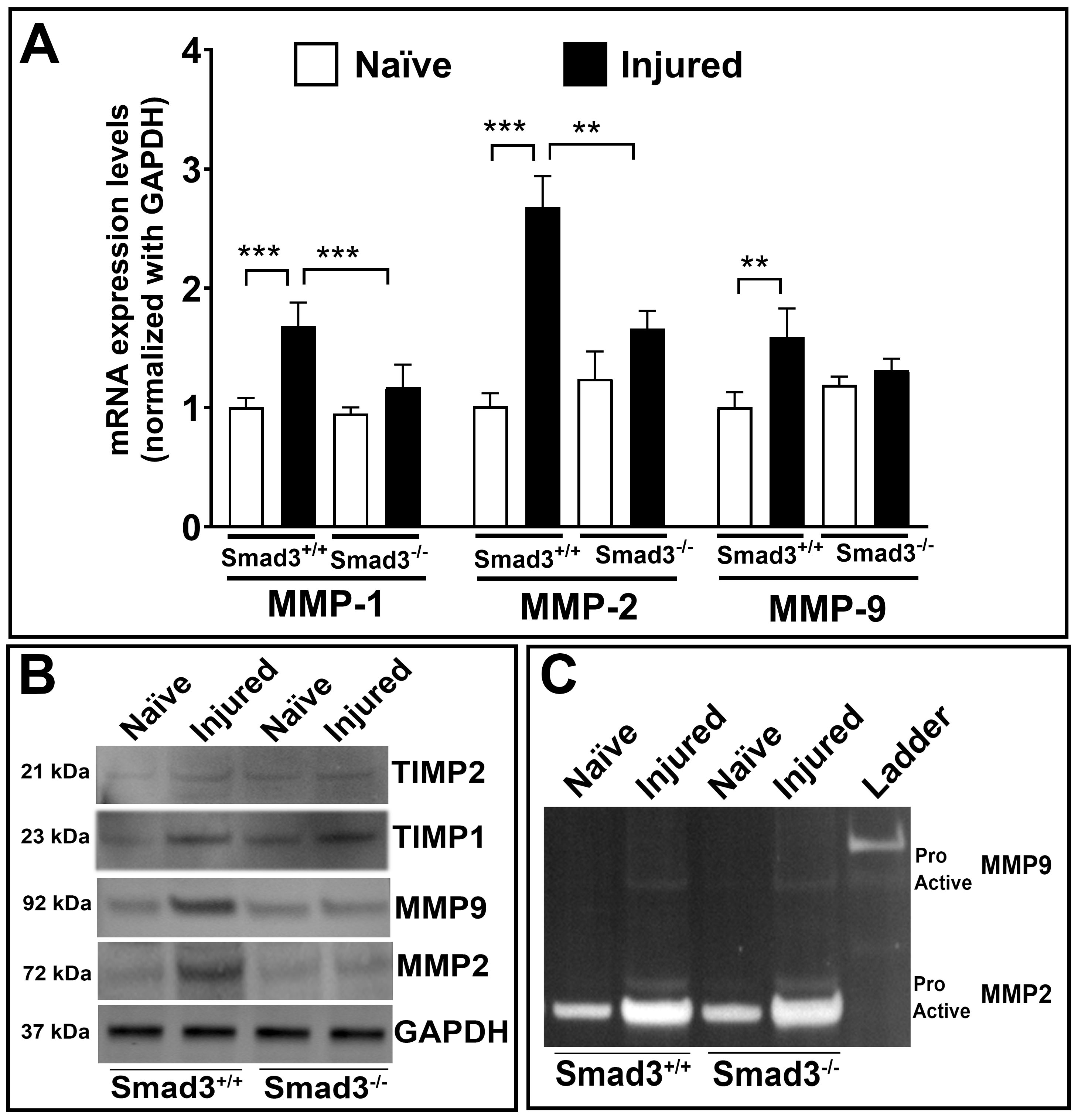 after alkali injury. A: The comparative mRNA expressions of MMP1, MMP2, and MMP9 showed significantly reduced expression in Smad3−/− mouse corneal tissue after alkali injury compared with Smad3+/+ mouse corneal tissue after alkali injury. B: The western blot showed similar trends of MMP and TIMP expression in the corneal tissue lysate of Smad3−/− mice compared with Smad3+/+ mouse corneal tissue lysate. C: Gelatin zymography showed the pro and active MMP patterns in the corneal tissue lysate of Smad3−/− mice compared with Smad3+/+ mouse corneal tissue lysate. The results are expressed as mean ± SEM, and p<0.05 was considered significant.