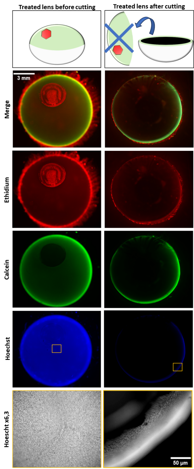 To access the data, click or select the words “Appendix 1.” Specificity of the triple HEC staining on epithelial cells. Observation of a cryo-applied lens before and after cutting off its anterior pole. Marking remains confined to the epithelium and does not mark the mass of anucleate fibers. The orange rectangle and the zoom showed the fluorescent band at the edge of the lens corresponding to epithelial cells that have not been cut.