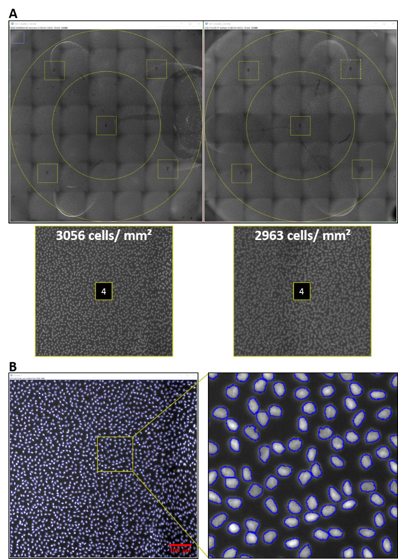 At the bottom is an example of zone four of each image. B: Automatic counting of Hoechst-stained nuclei with the CorneaJ plugin.
