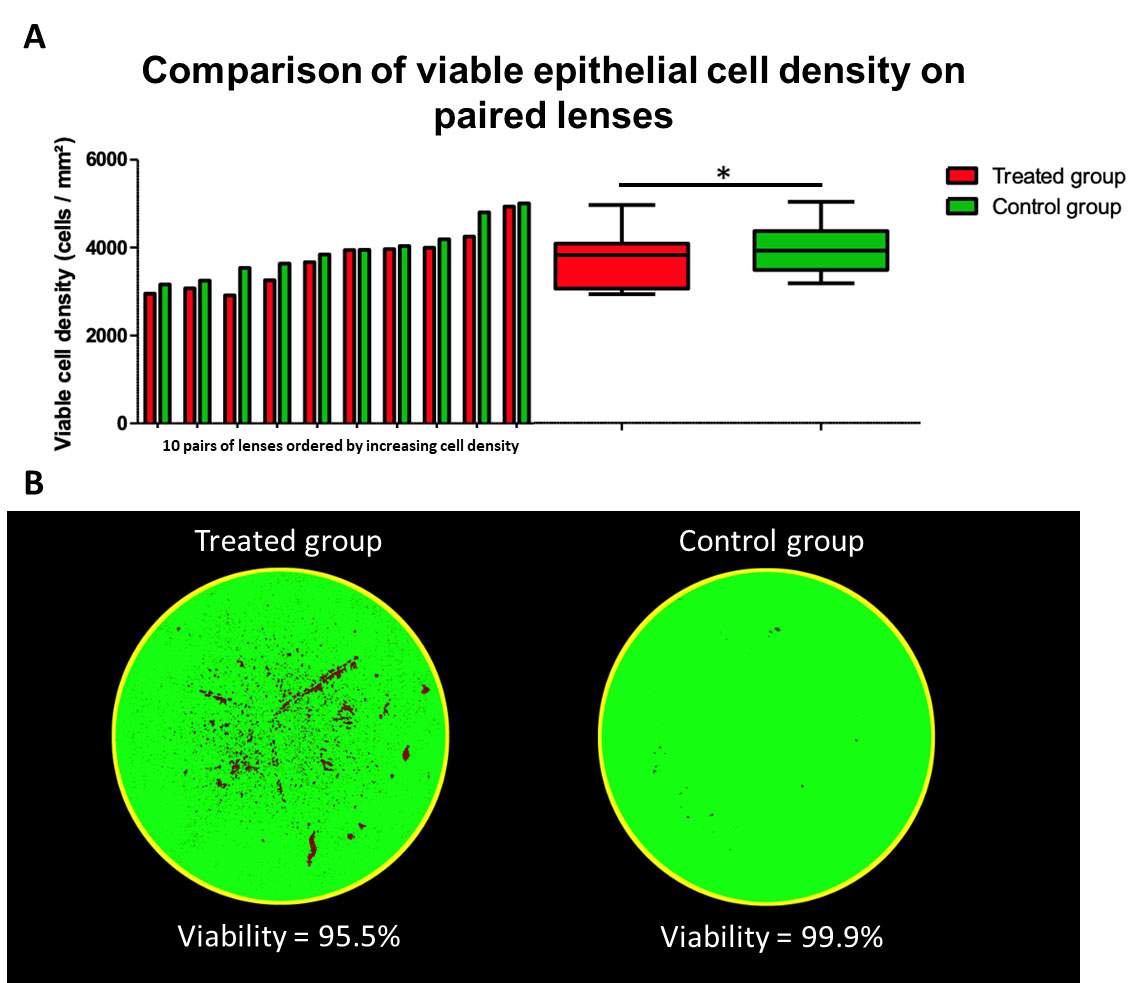 left is the treated lens with the lowest vECD (viability = 95.5% and vECD =2,918 cells/mm2), and its untreated control lens is on the right (viability = 99.9% and vECD = 3,535 cells/mm2).
