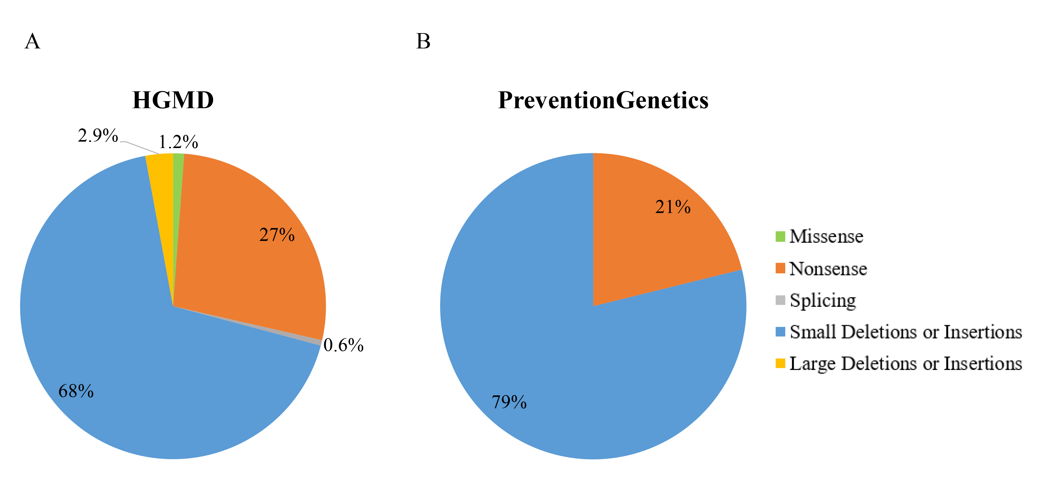 Figure 2. Distributions of the Causative Variant Types in ORF15. A. DM variants of RPGR ORF15 from the commercial version of the human gene mutation database (HGMD). The HGMD is a compilation of all the causative