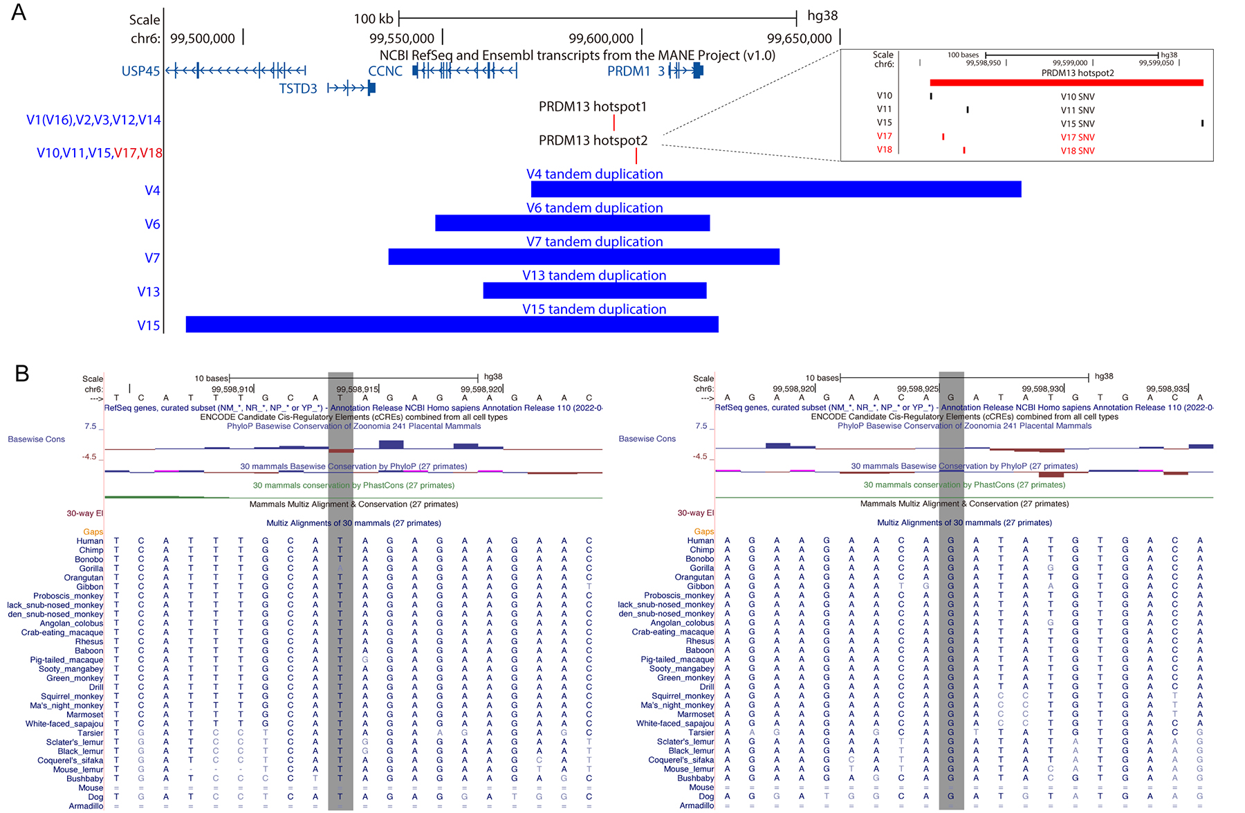 between V10 and V11 (mutational hotspot-2). B: Conservation map for V17 and V18 in 28 mammals. Both variants are well conserved within primates and mammals.
