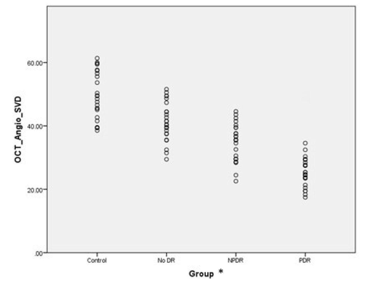 Figure 3. Superficial vessel density values (%) on optical coherence tomography angiography in different diabetic retinopathy stages.