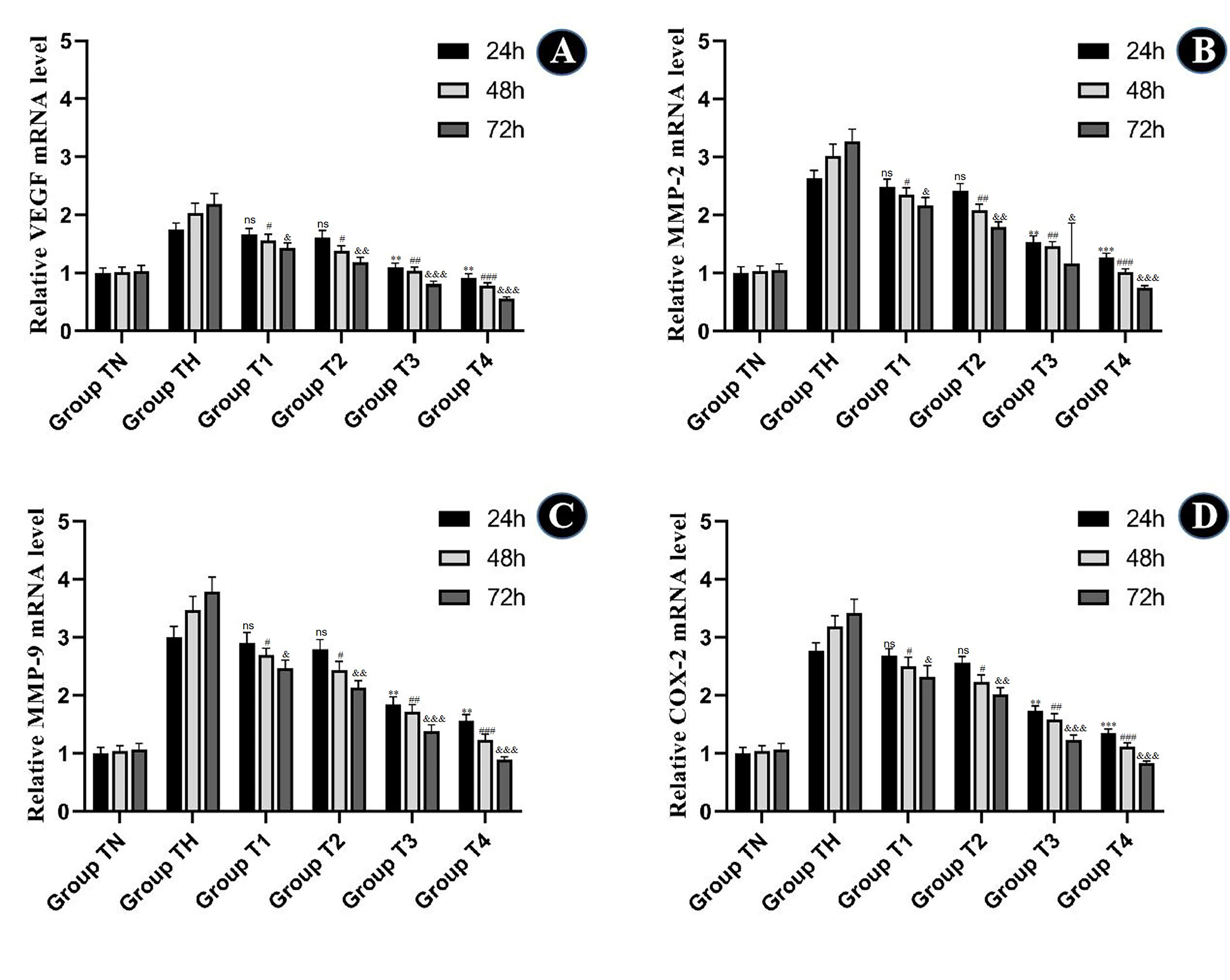 Figure 6. The relative mRNA level in each group. Expression levels of vascular endothelial growth factor (A), matrix metalloproteinase 2 (B), matrix metalloproteinase 9 (C) and cyclo-oxygenase 2 (D) mRNA in different groups of human retinal capillary endothelial cells. ns: not significant; **p<0.01, ***p<0.001 compared